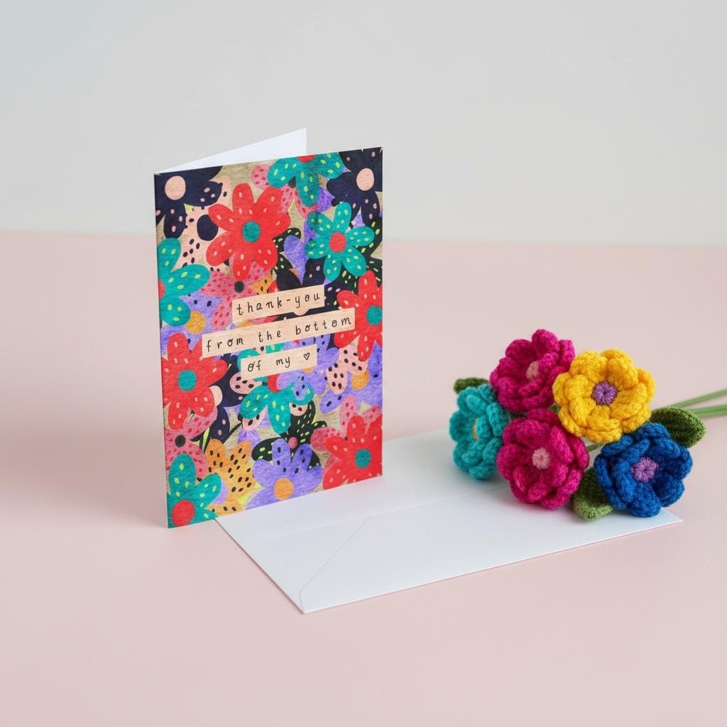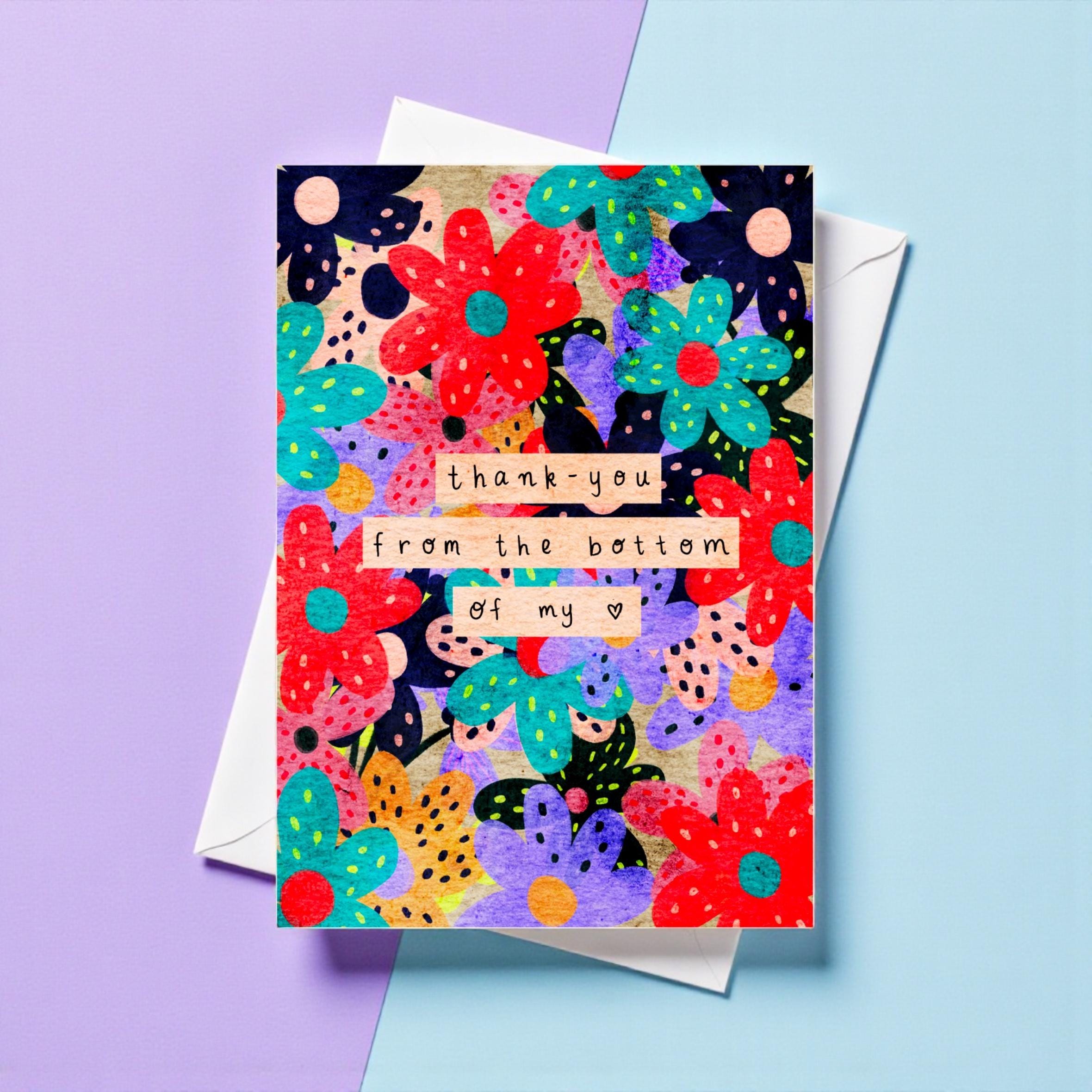 Gorgeous blooms and the words “Thank You from the Bottom of my Heart” complete this hand-illustrated thank you card.