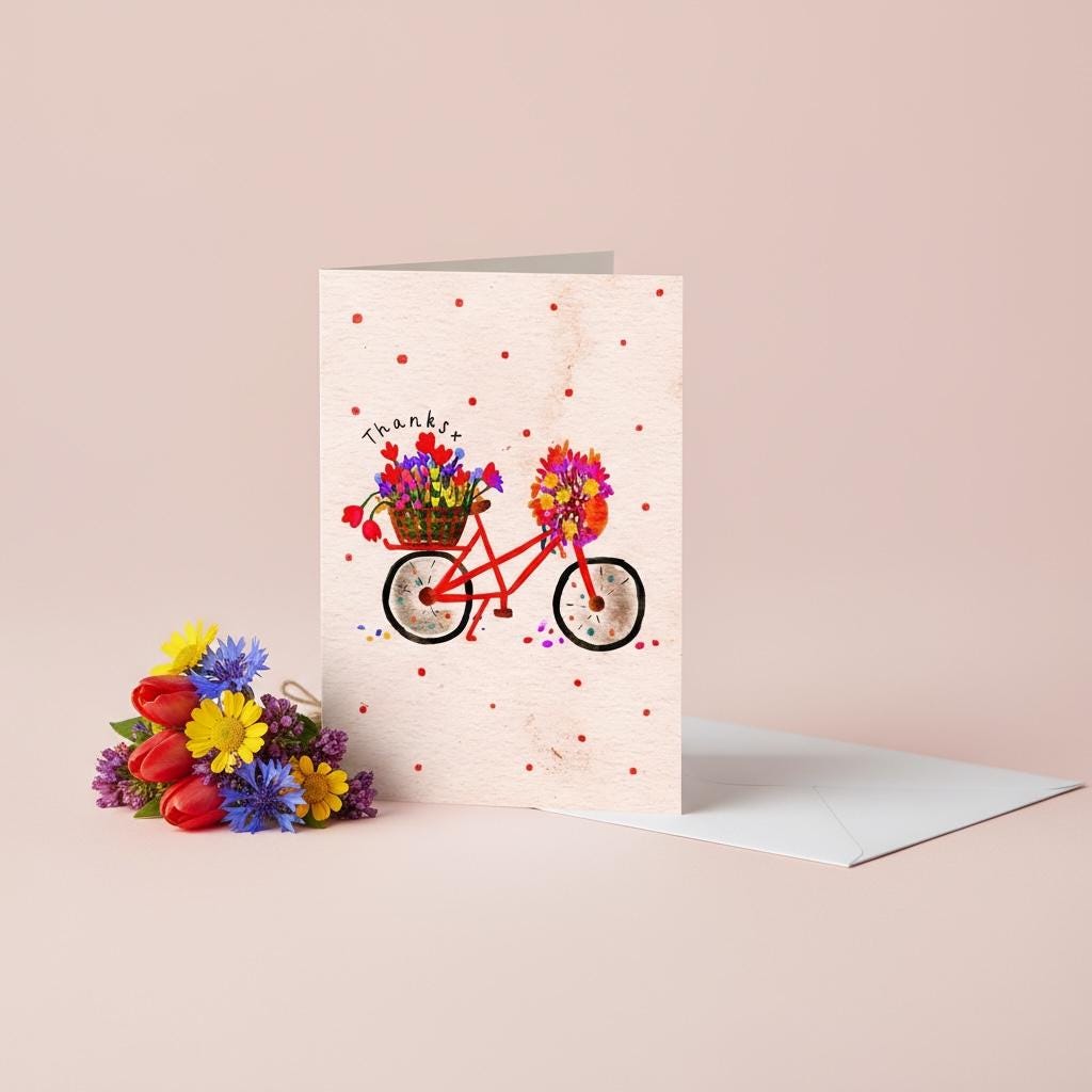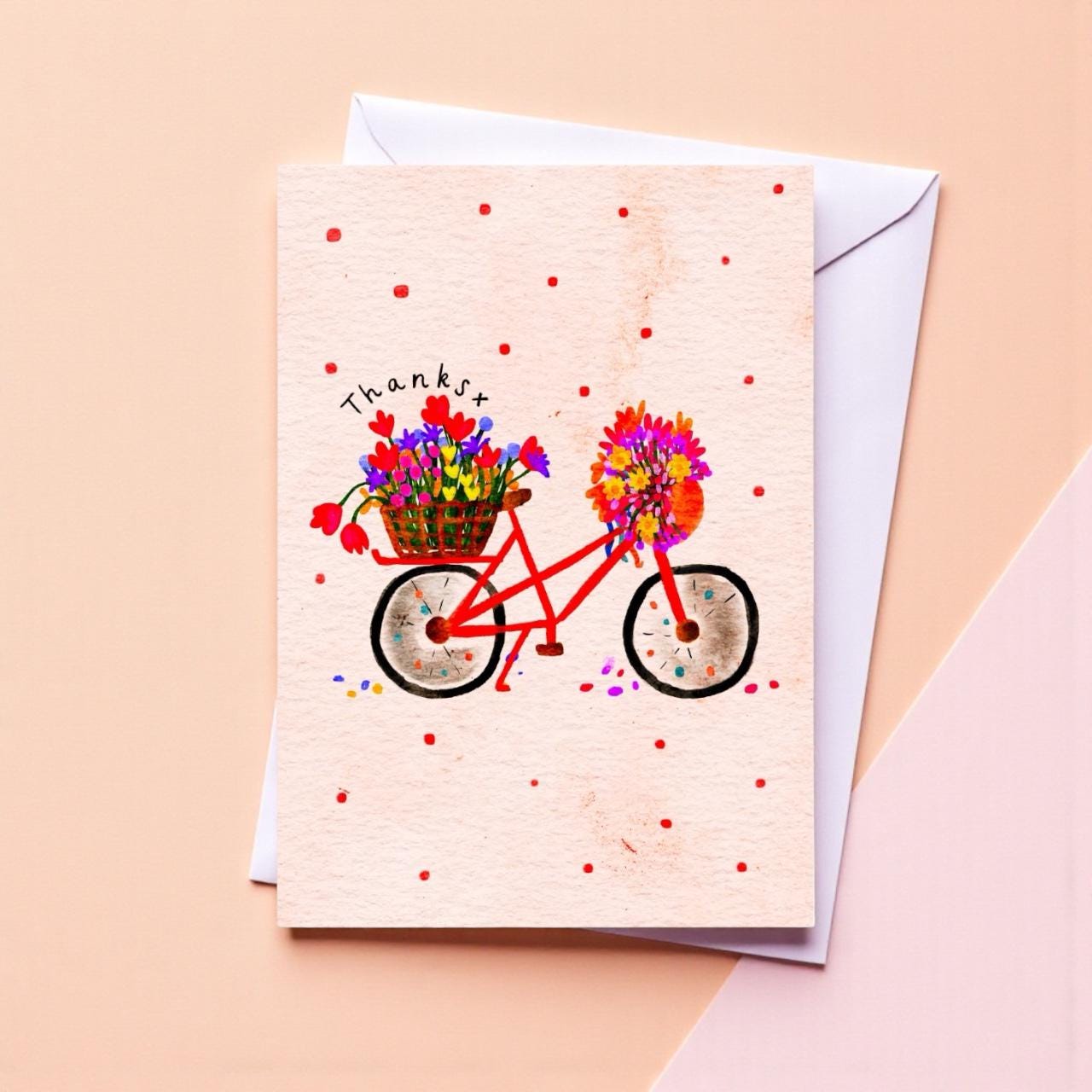 A gorgeous and fun hand-illustrated thank you card featuring a bicycle overflowing with flowers and the word “Thanks”.
