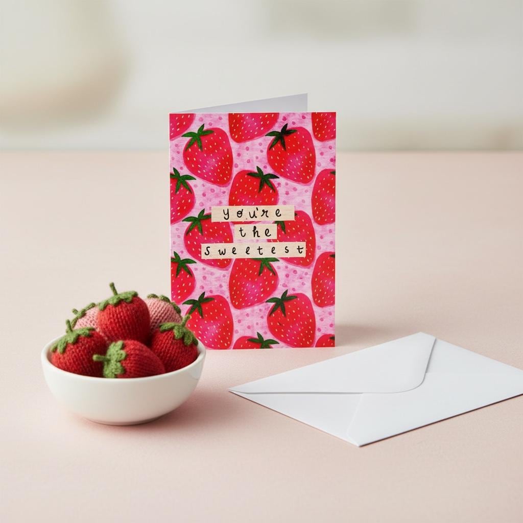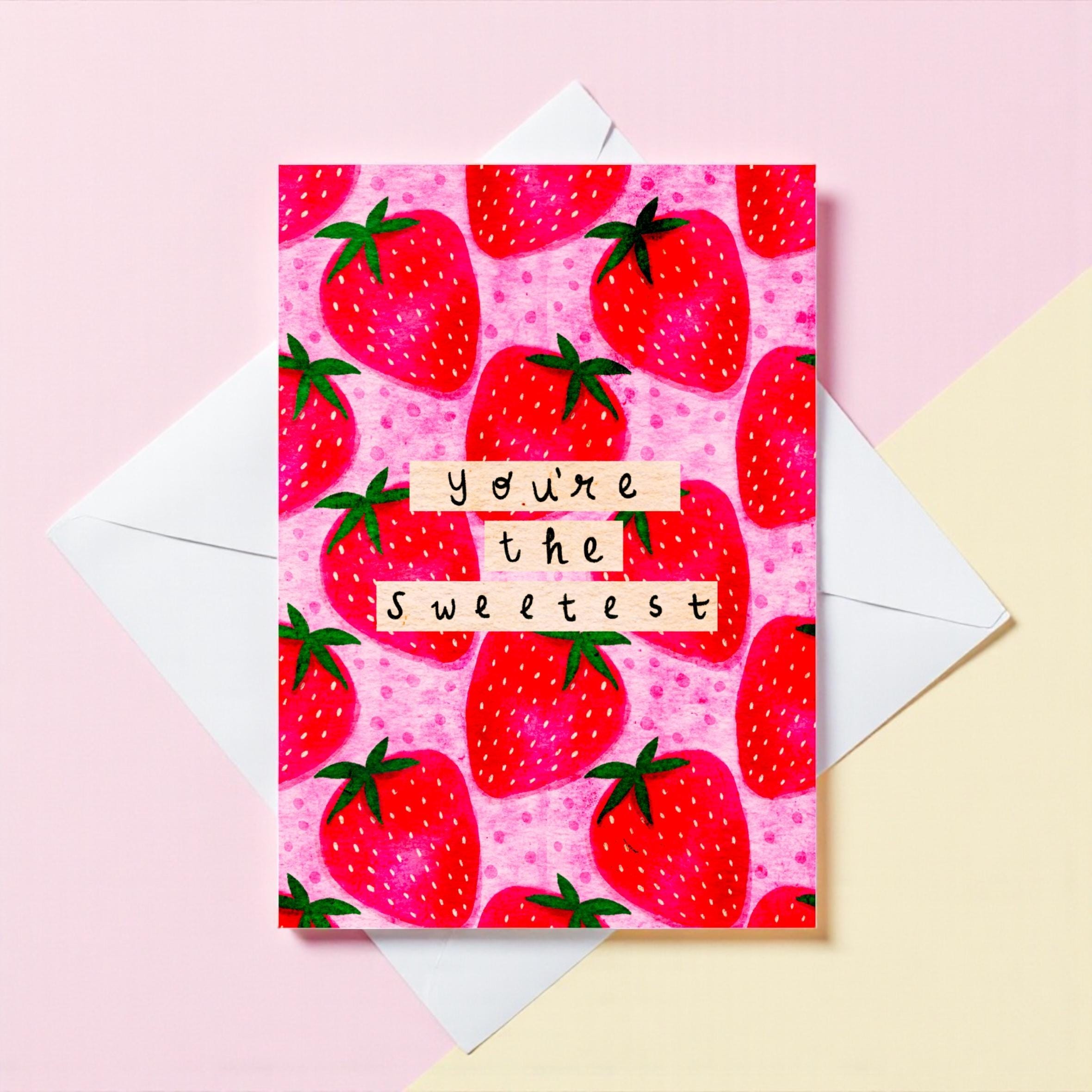 Who doesn’t like a bright strawberry? This everyday greeting card features hand-illustrated strawberries and the words “You’re the Sweetest”