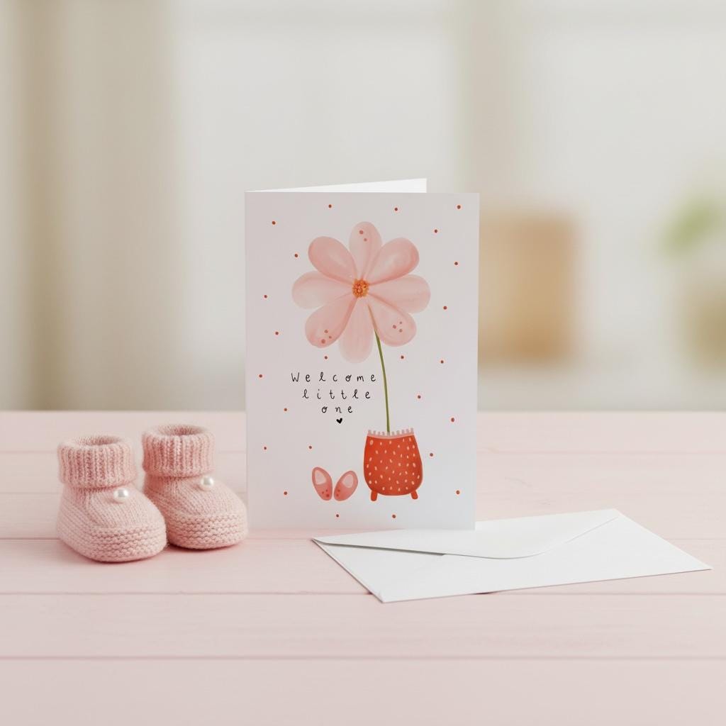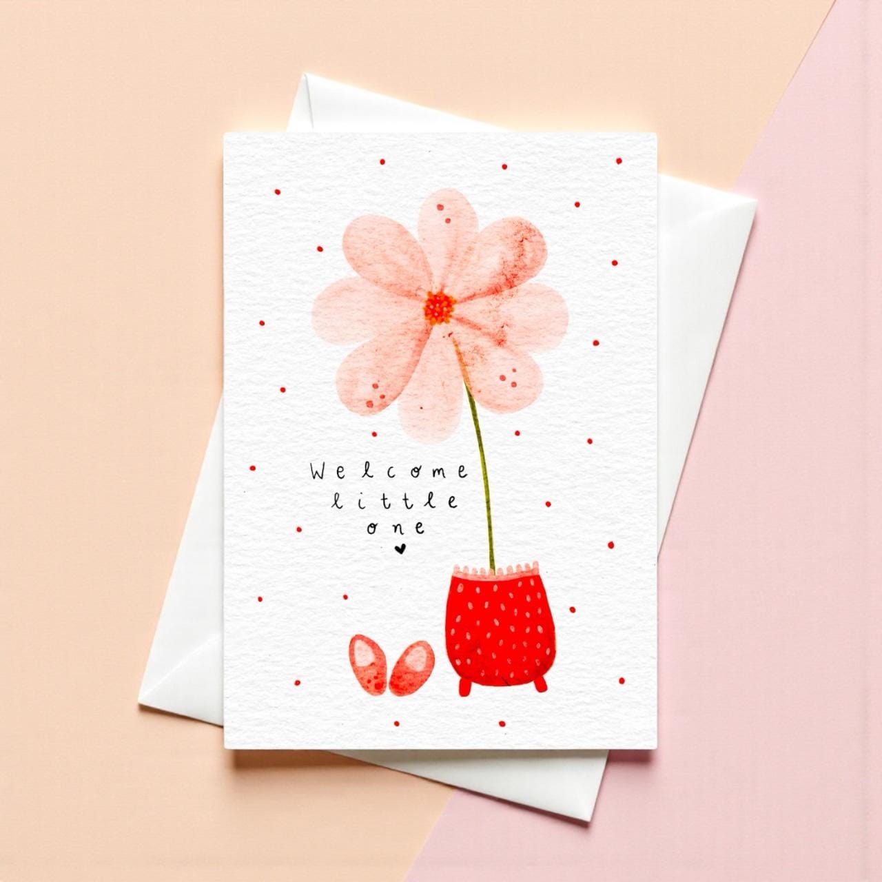 Perfect for a new baby, this hand-illustrated Greeting Card features the words “Welcome Little One”.