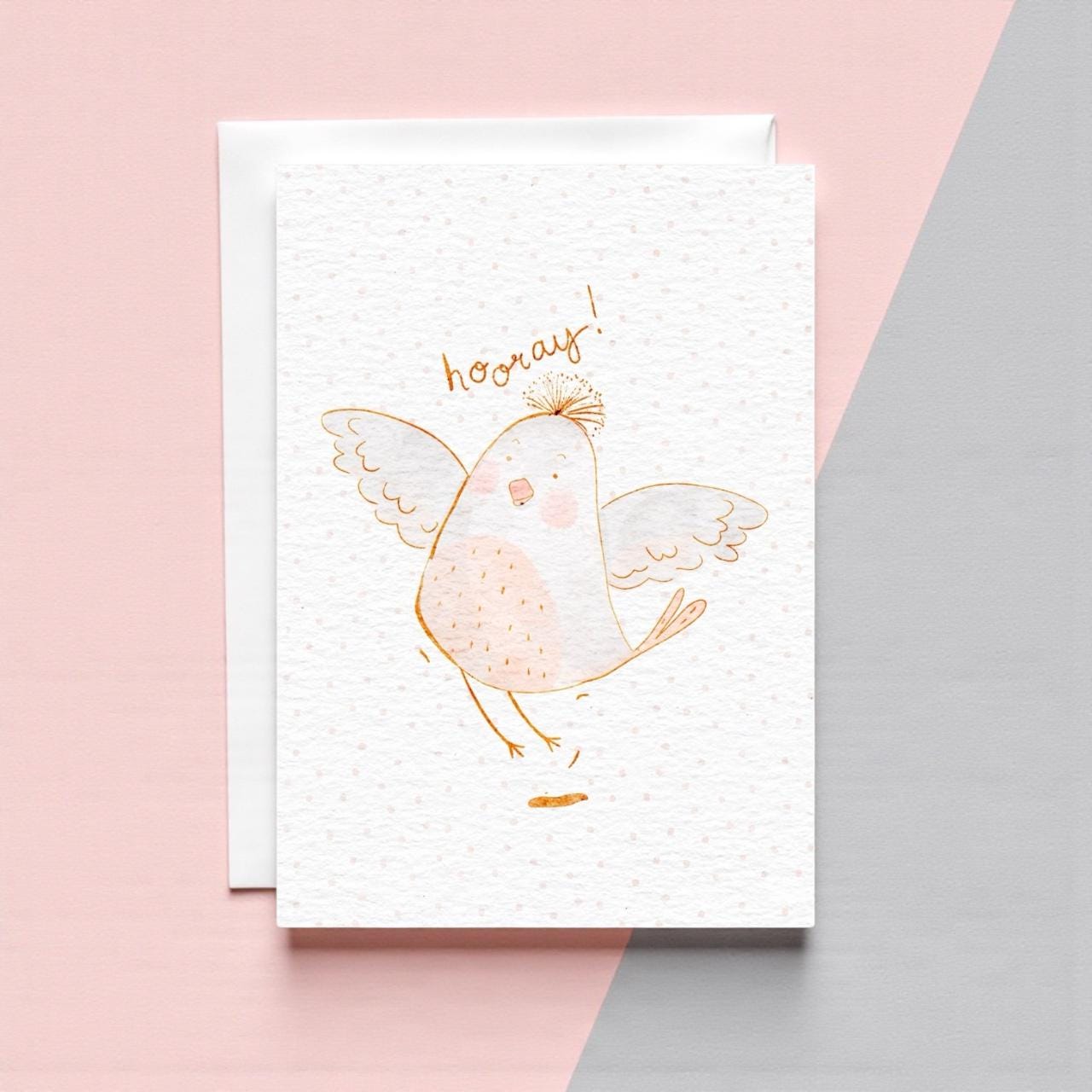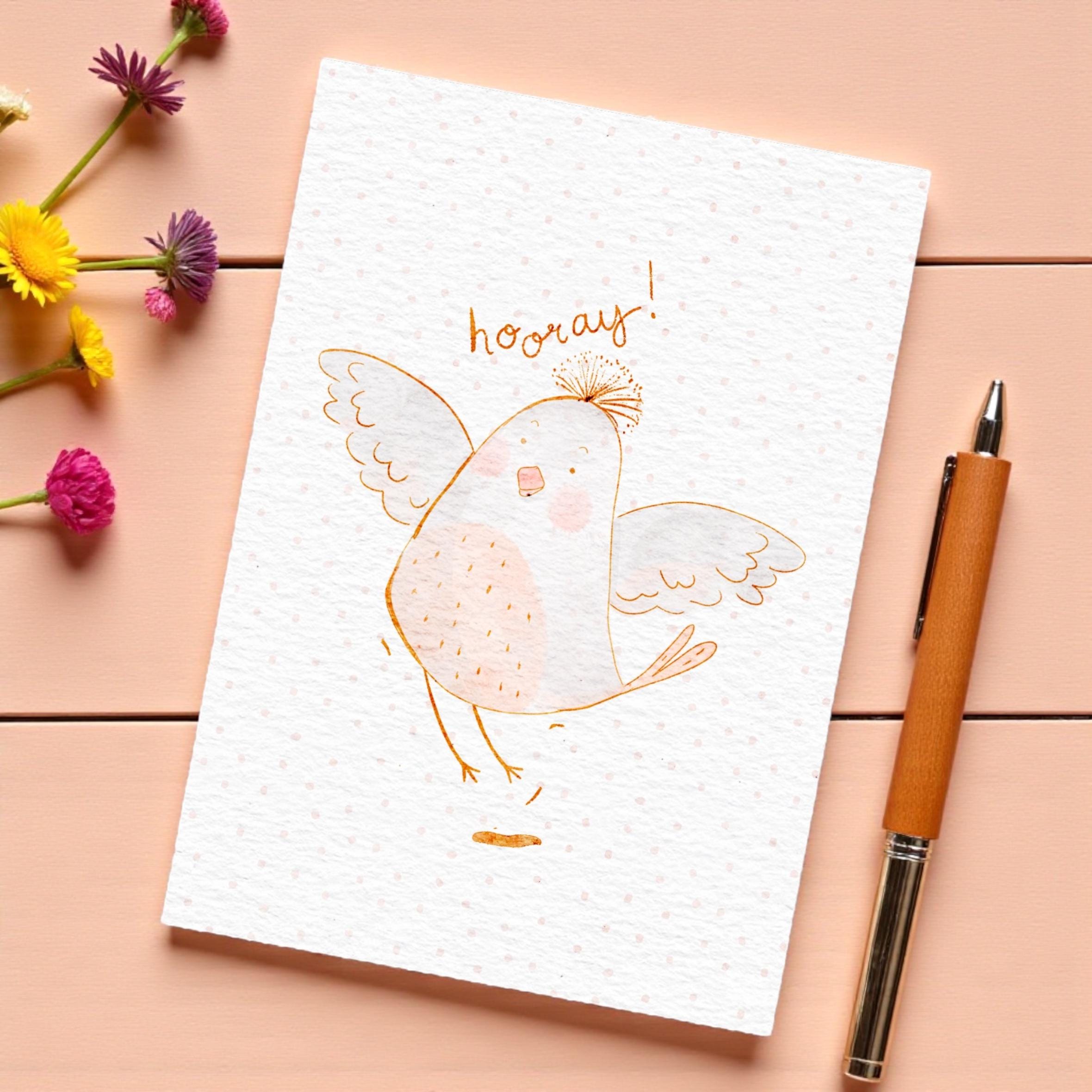 This everyday card features sweet watercolour illustration of a bird jumping for joy with the word “Hooray!” Perfect to keep in your card stash!