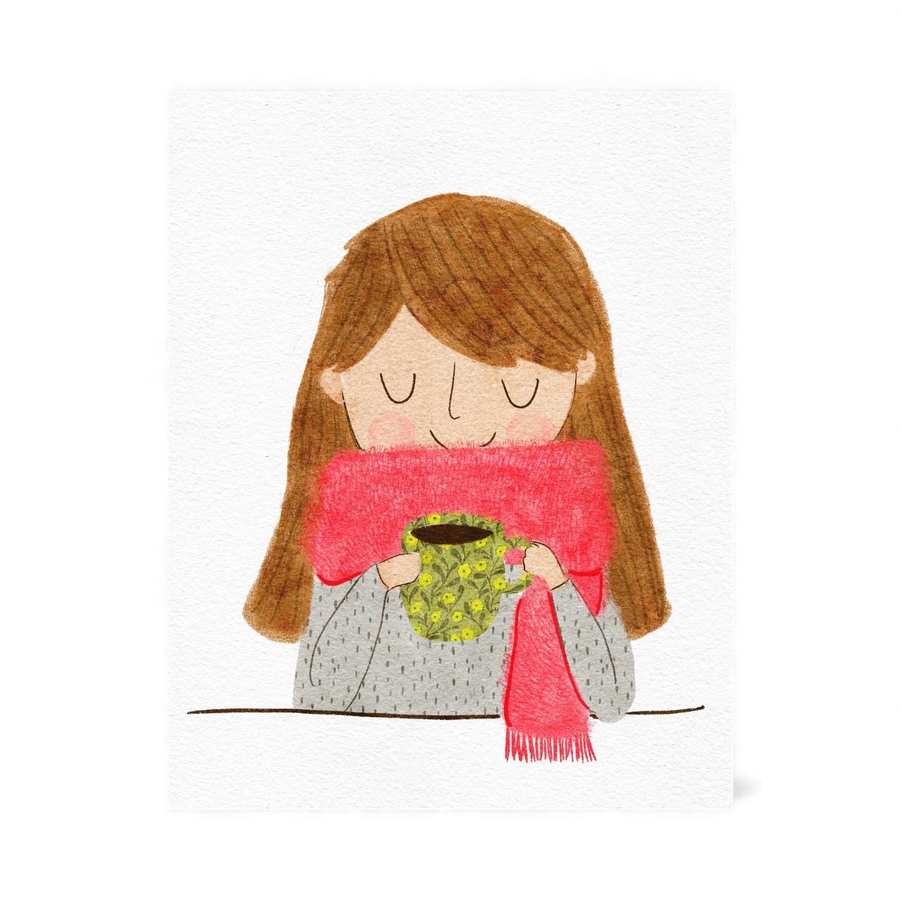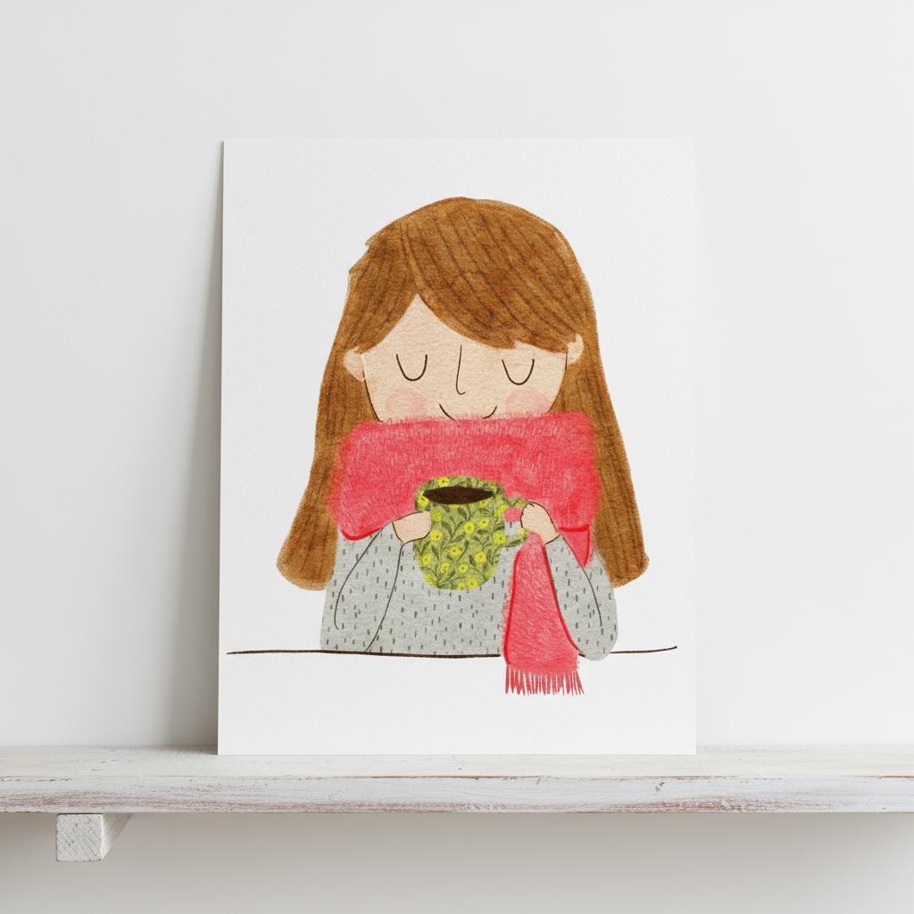 Cosy coffee drinker illustration. These A5 prints are thick enough to lean on a shelf or to use as wall decor without a frame. They look sweet on their own or grouped together as a collage.