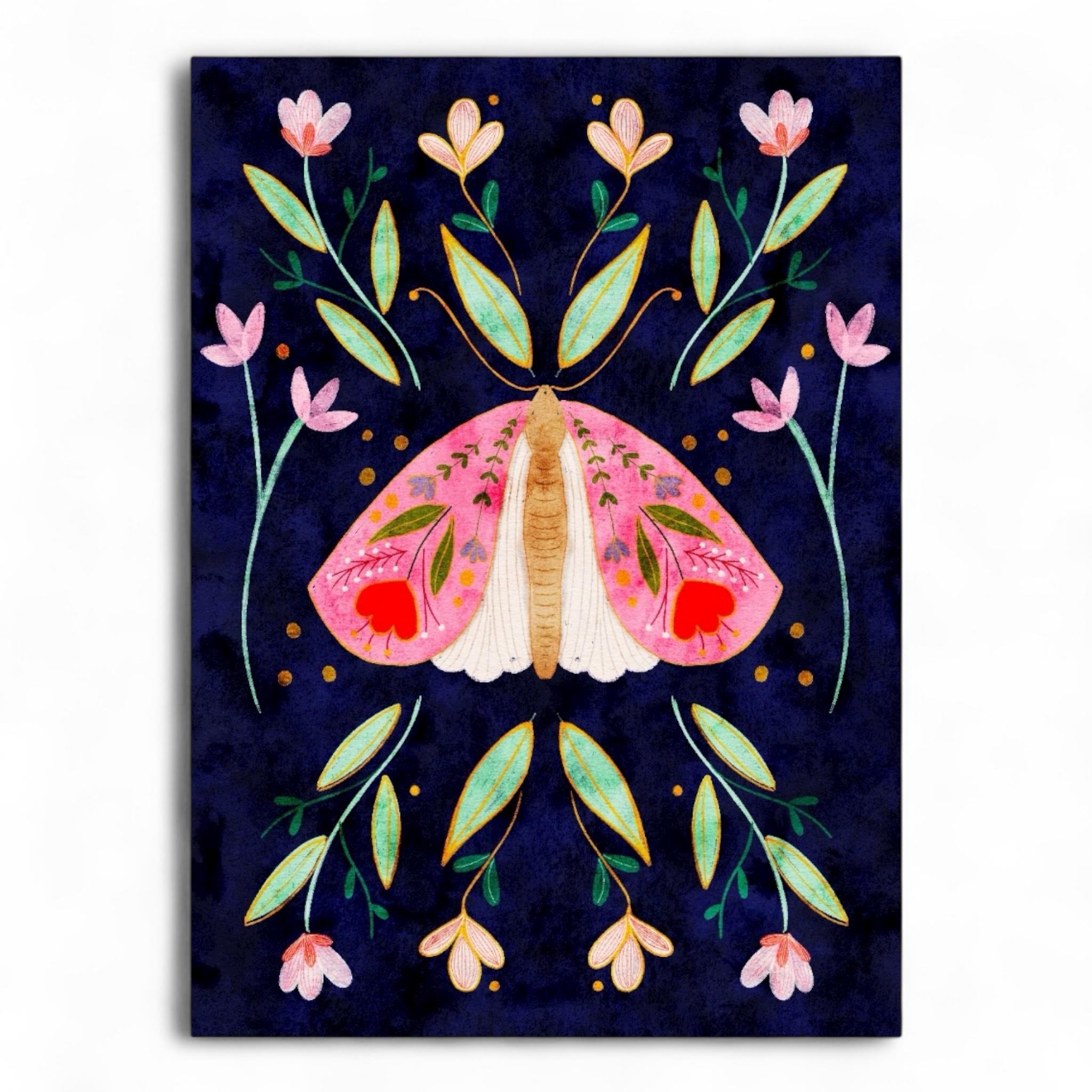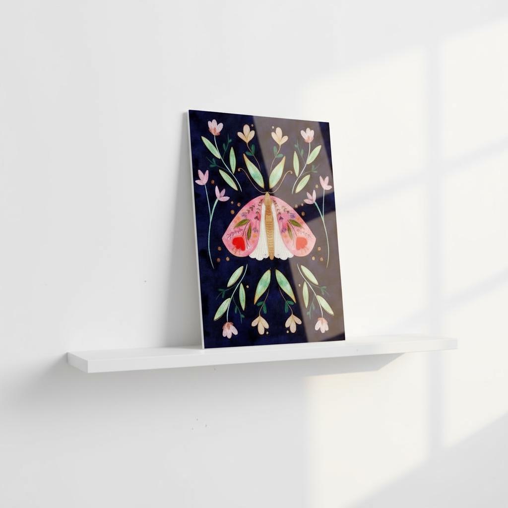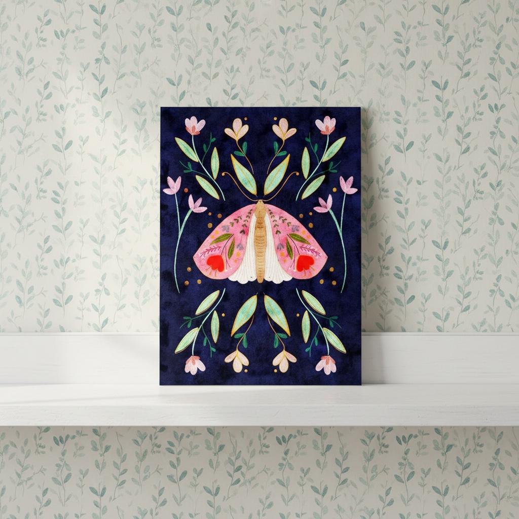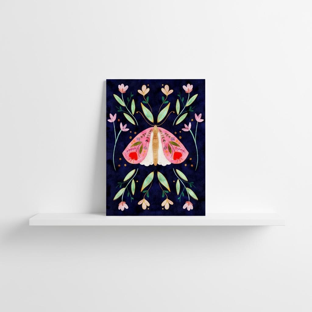 Gorgeous illustration of a pink moth on a navy background. These A5 prints are thick enough to lean on a shelf or to use as wall decor without a frame. They look sweet on their own or grouped together as a collage.