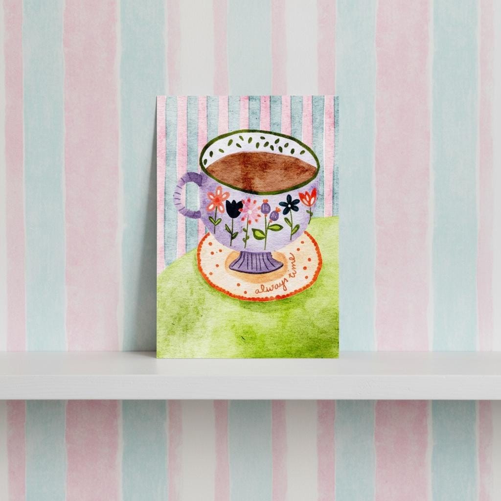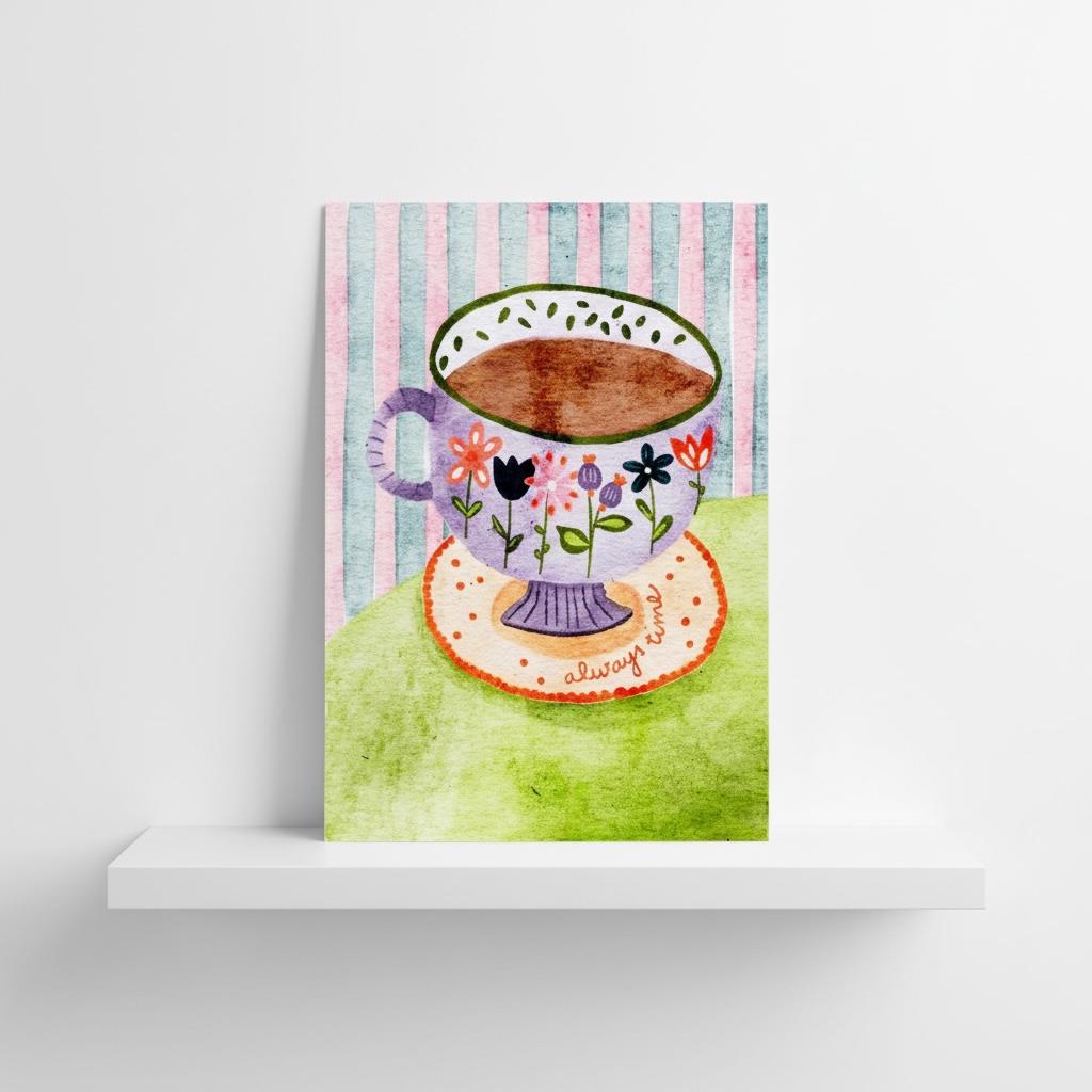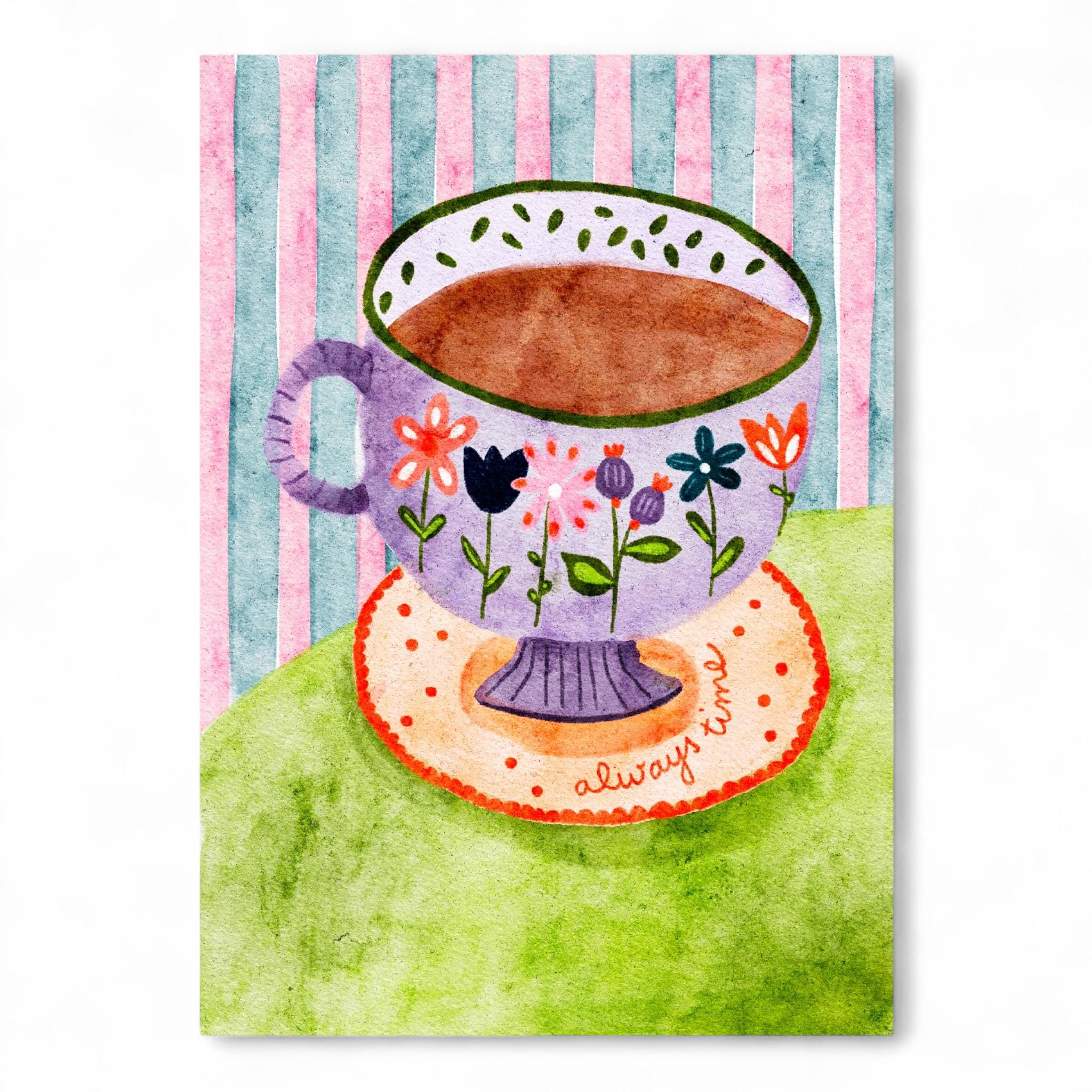 A cute still-life illustration of a floral tea cup. These A5 prints are thick enough to lean on a shelf or to use as wall decor without a frame. They look sweet on their own or grouped together as a collage.
