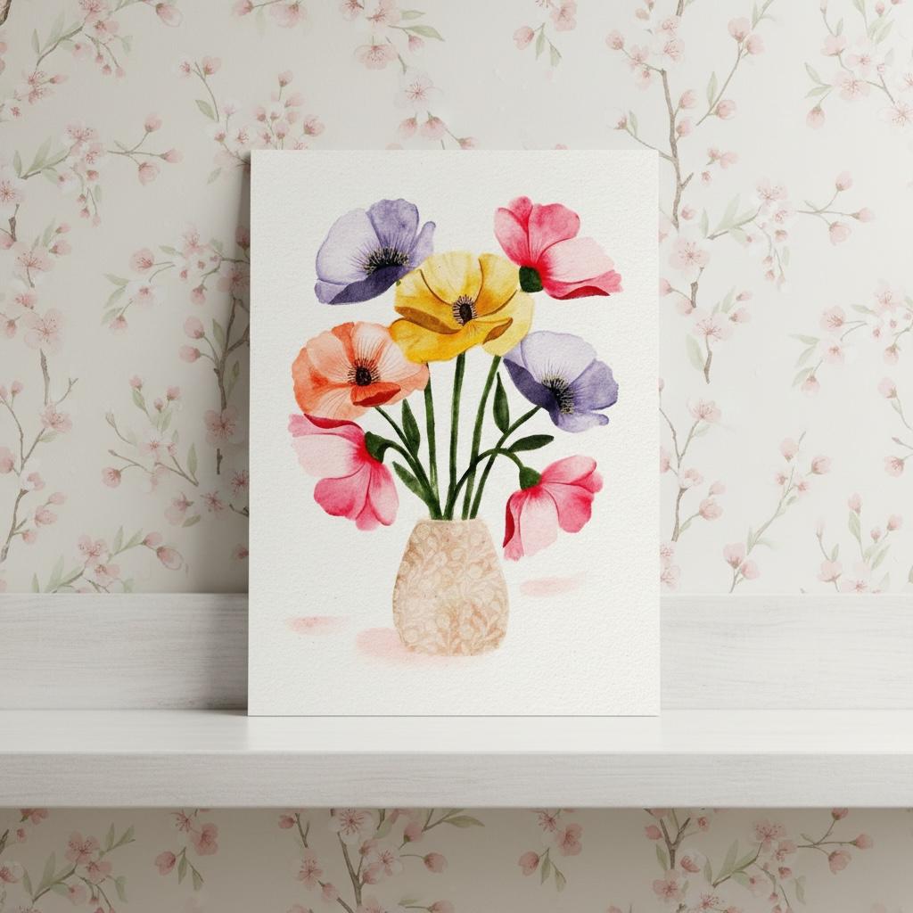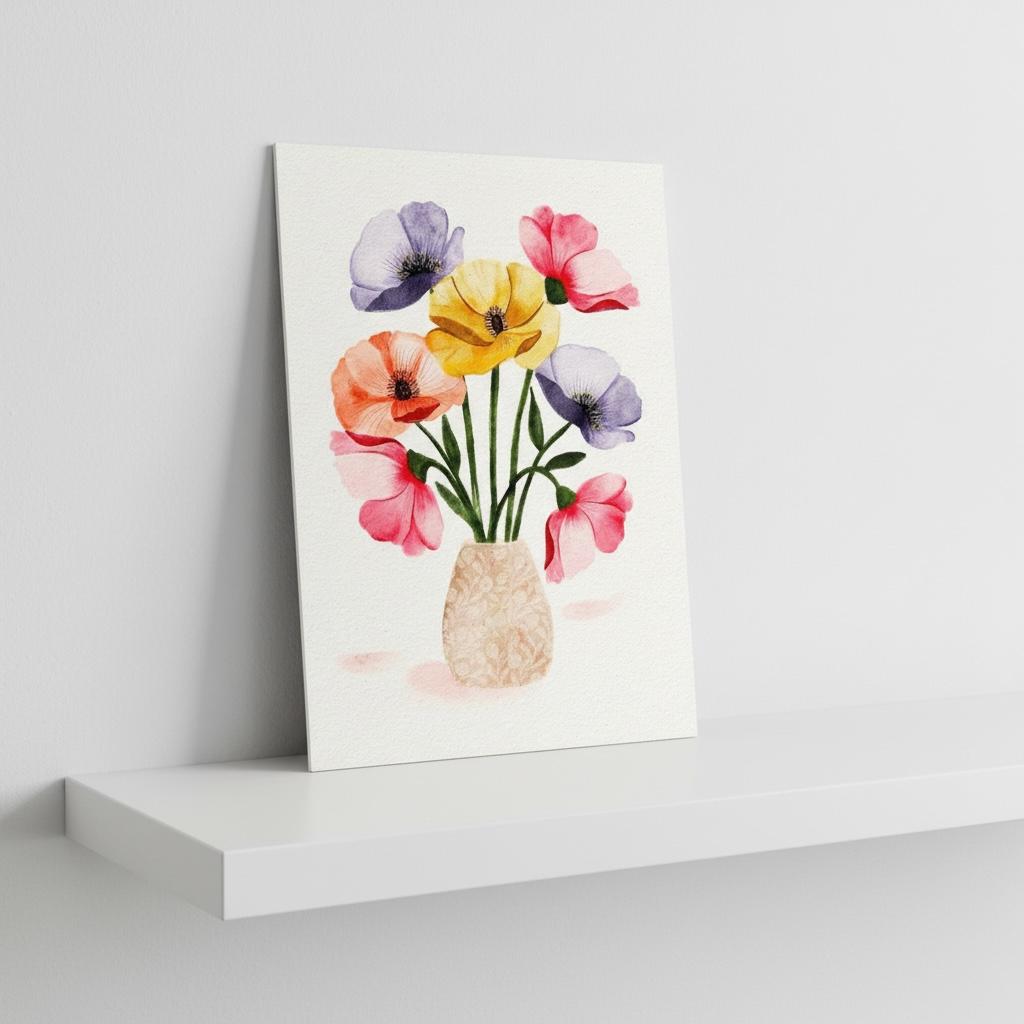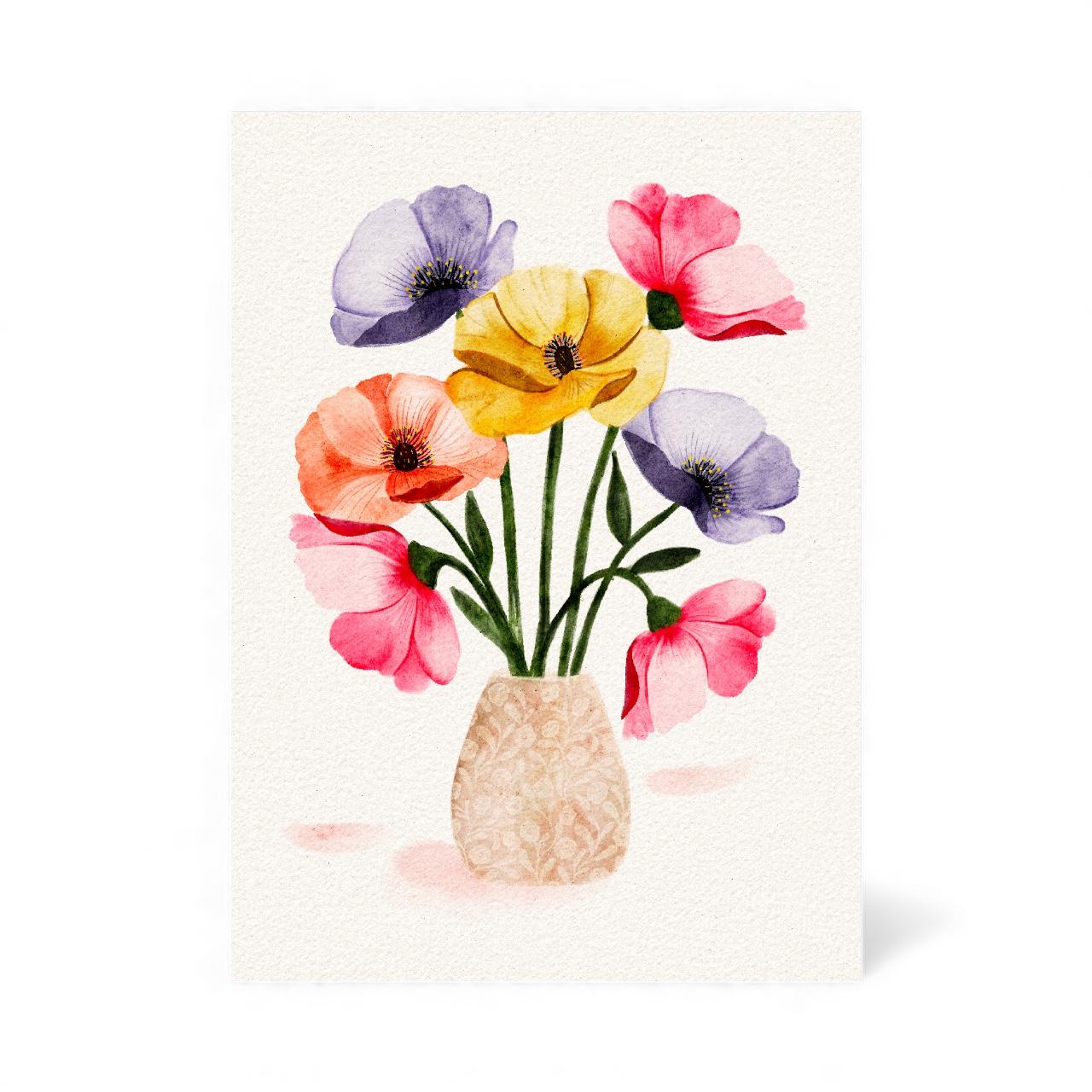 A cute still-life illustration of a bunch of poppies. These A5 prints are thick enough to lean on a shelf or to use as wall decor without a frame. They look sweet on their own or grouped together as a collage.
