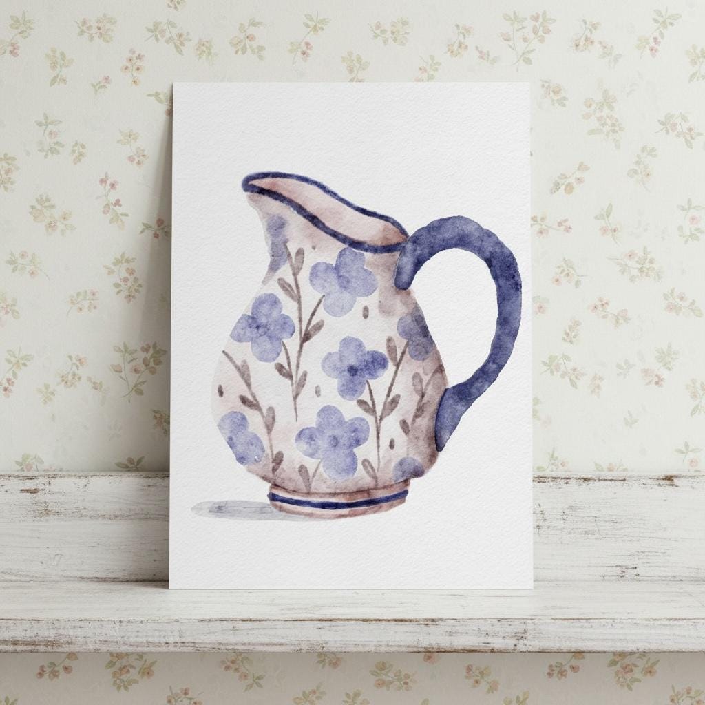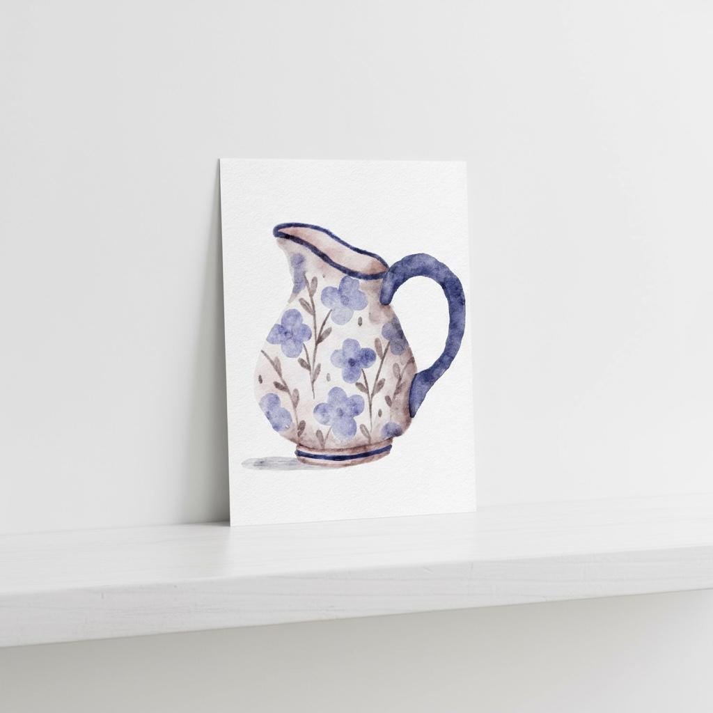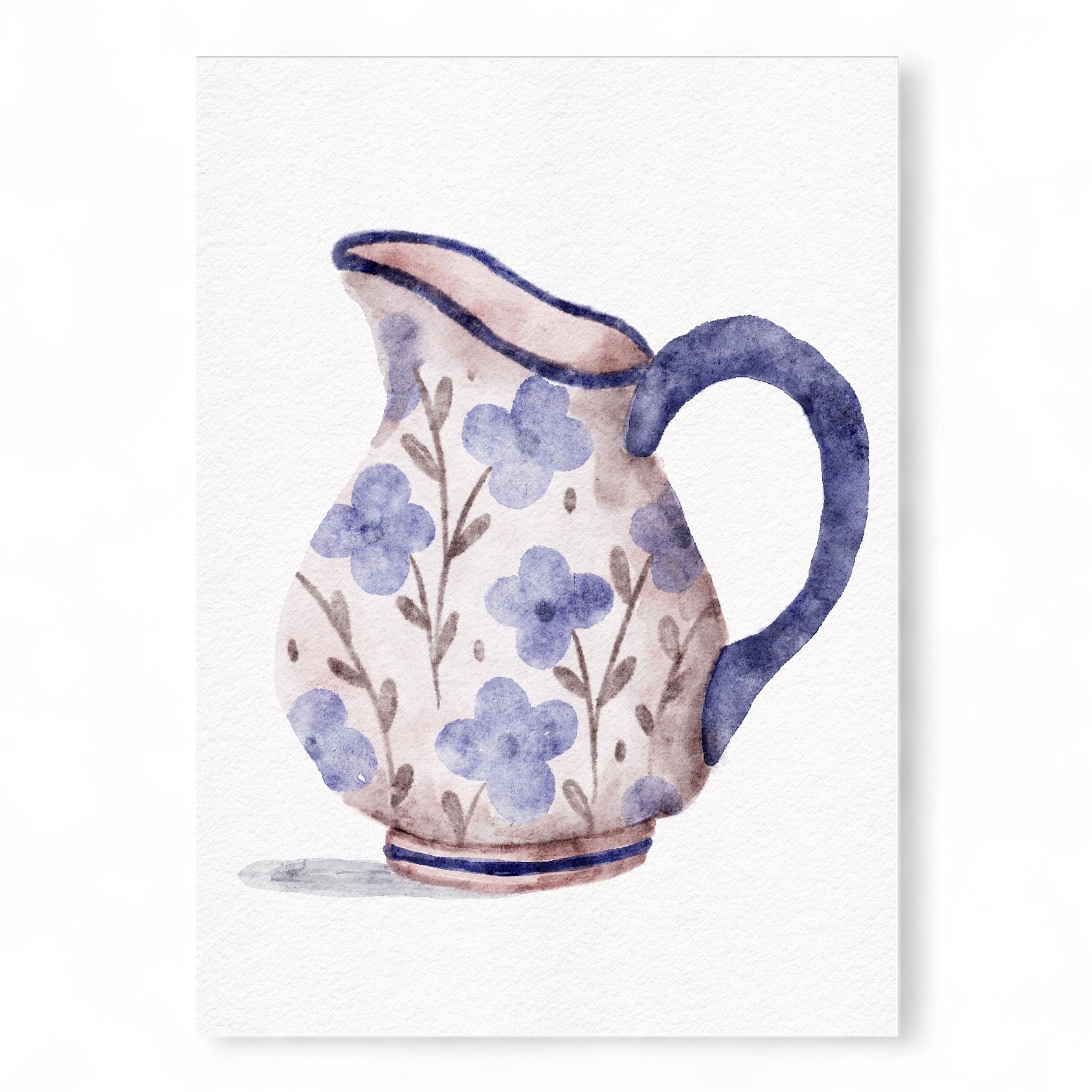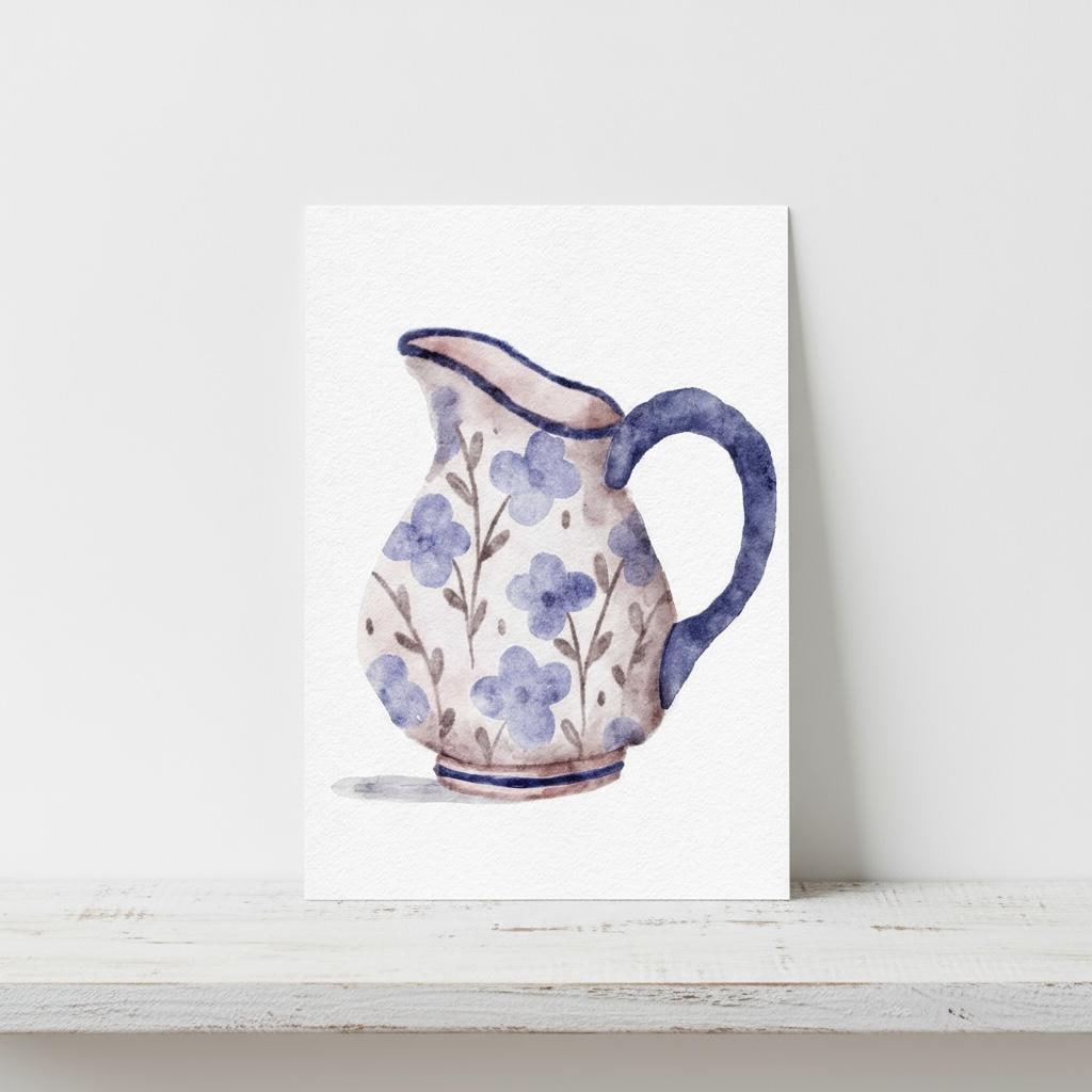 Gorgeous illustration of a blue floral jug. These A5 prints are thick enough to lean on a shelf or to use as wall decor without a frame. They look sweet on their own or grouped together as a collage.