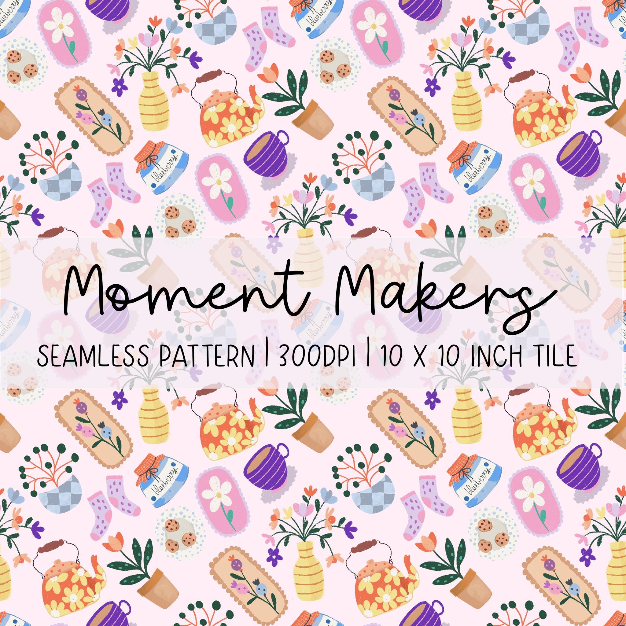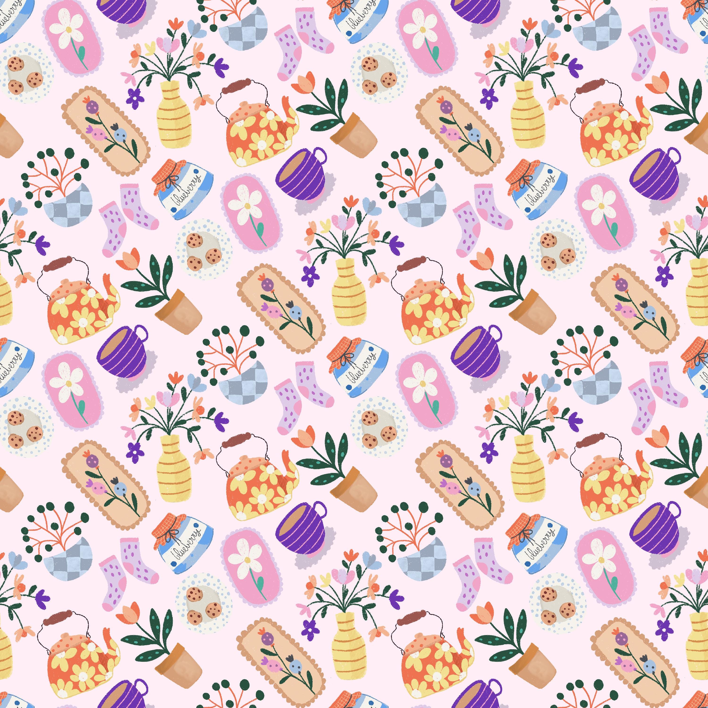Beautiful, hand illustrated seamless digital pattern featuring everyday items like plants, teapots, flowers, and socks. This pattern can be used for all manner of things such as textiles, homewares, clothing, phone cases and wrapping paper - the list is endless.