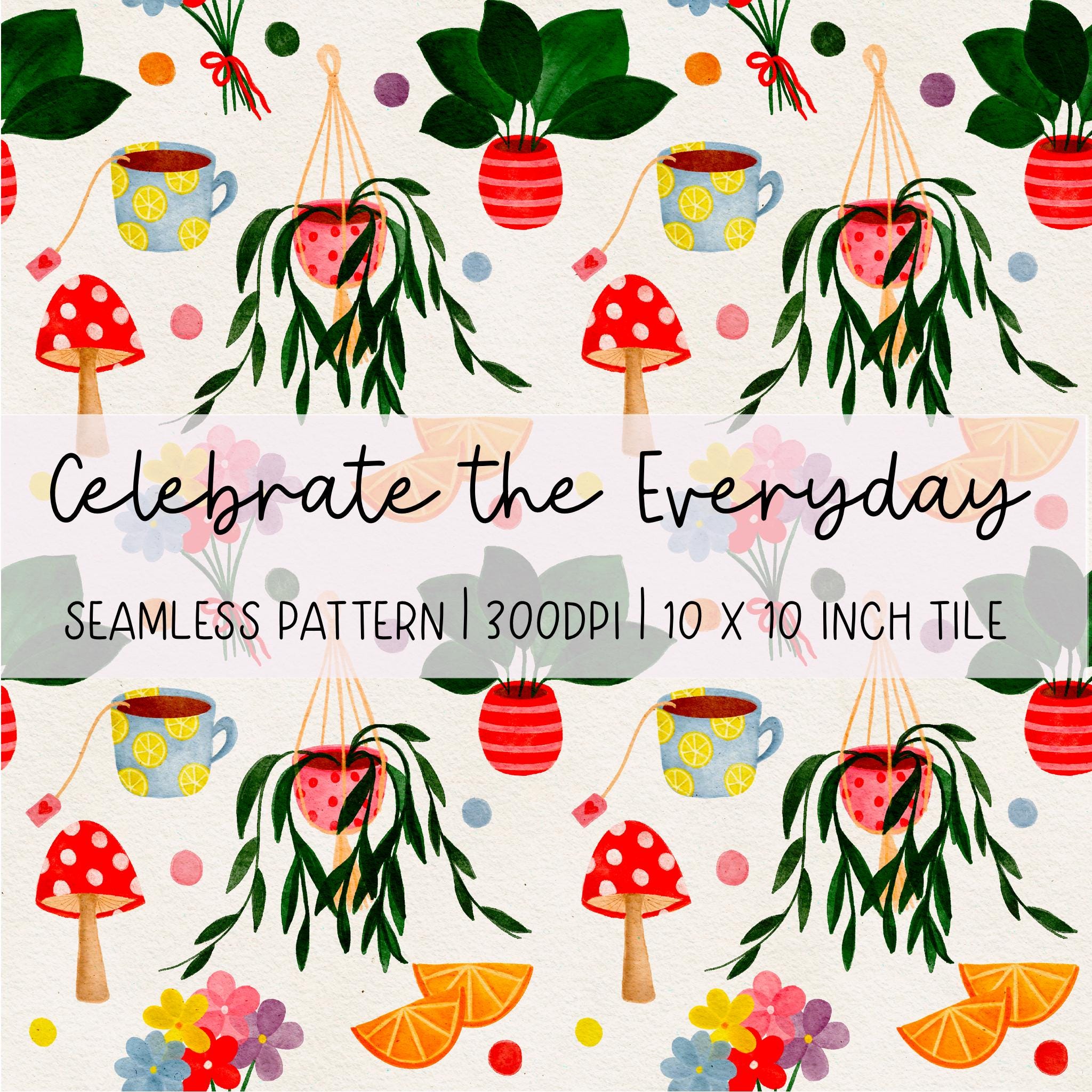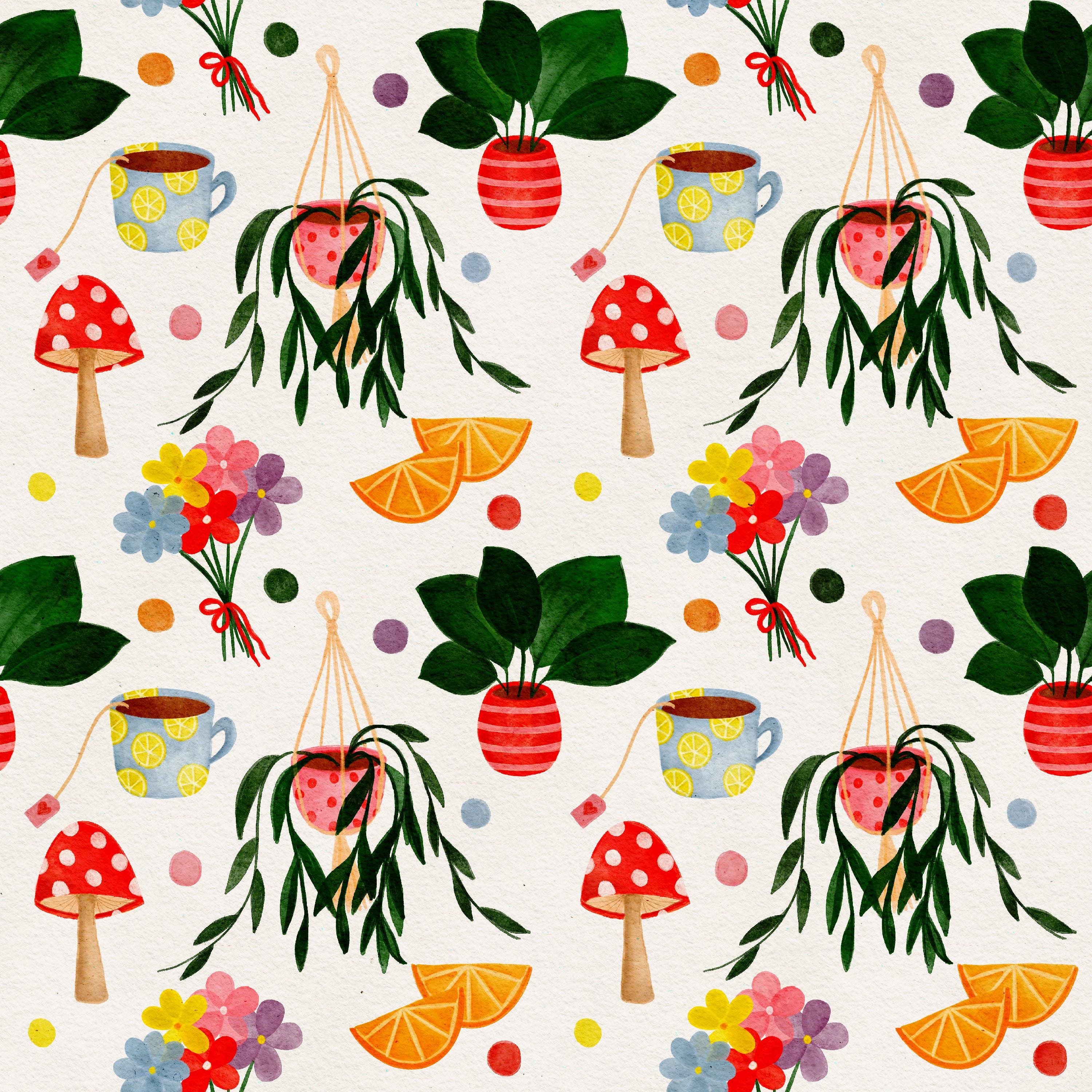 Beautiful, hand illustrated seamless digital pattern featuring everyday items like plants, oranges, mushrooms and flowers. This pattern is nice and bright and can be used for all manner of things such as textiles, homewares, clothing, phone cases and wrapping paper - the list is endless.