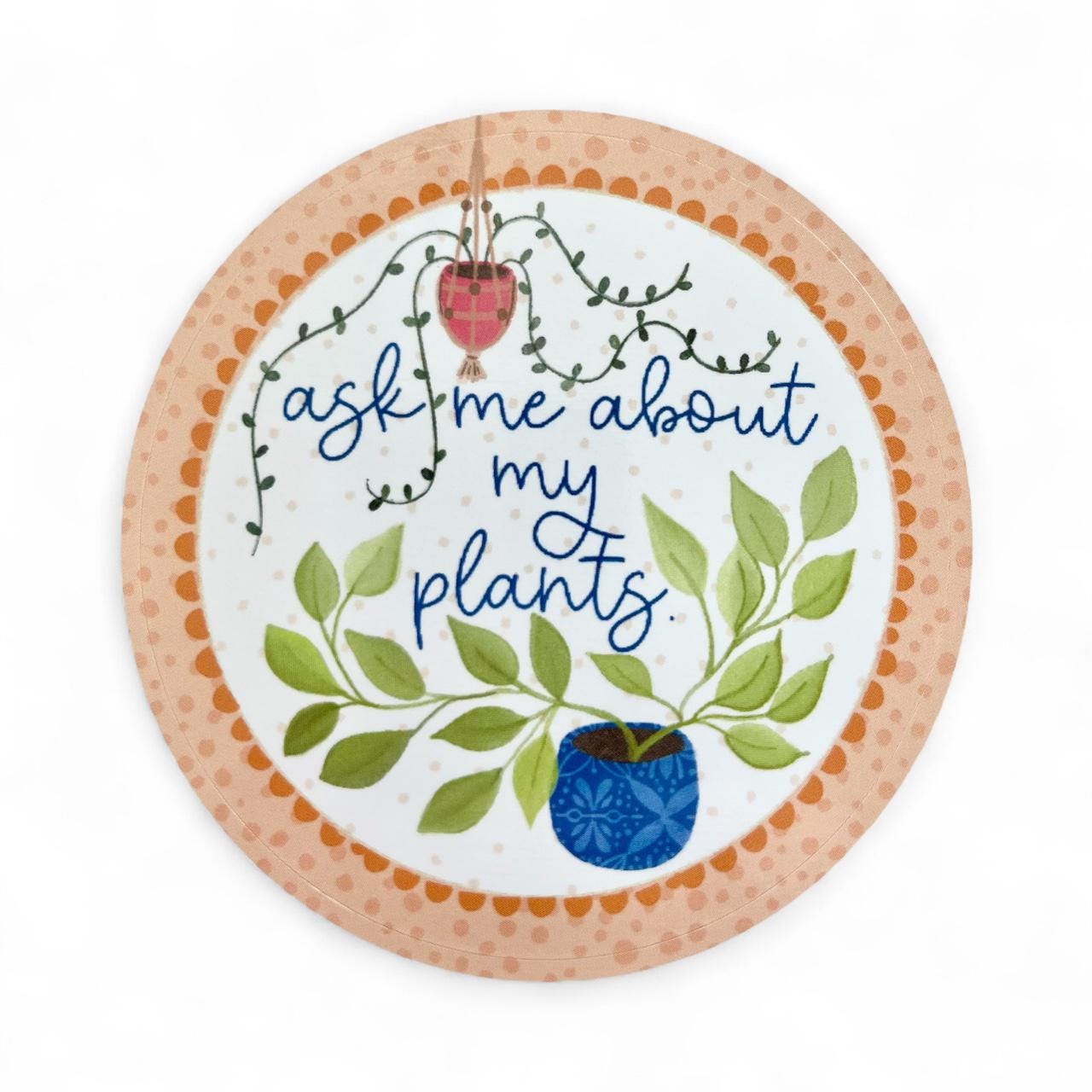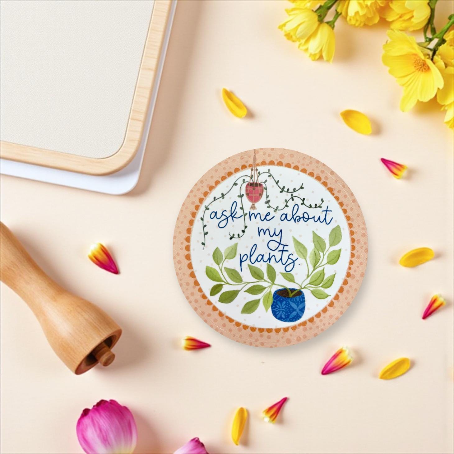 These are a cute way to personalise your stuff! 7.6 cm round “Ask me About my Plants” sticker or decal. Professionally printed on thick vinyl with a glossy finish. These come backed onto white paper for easy peeling.