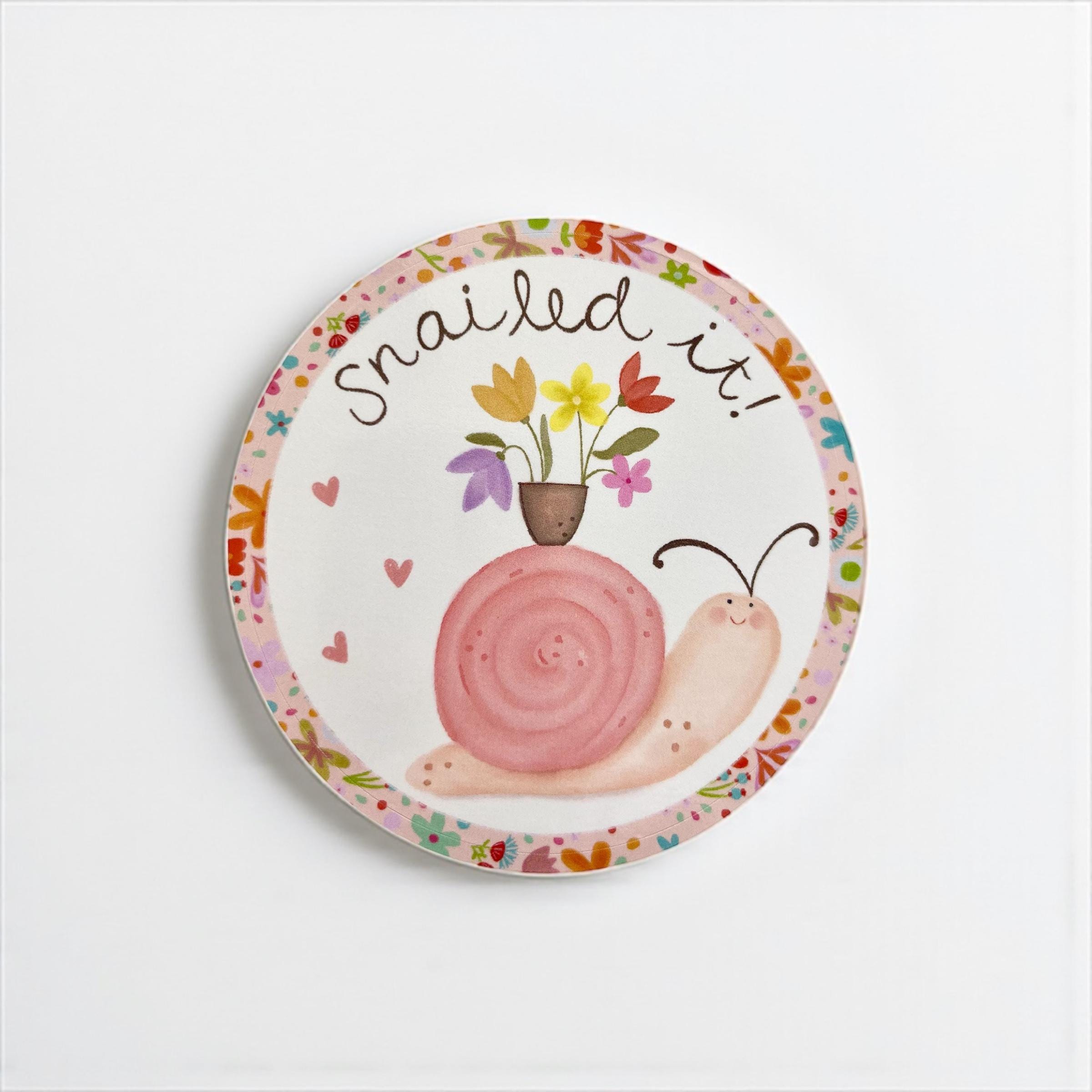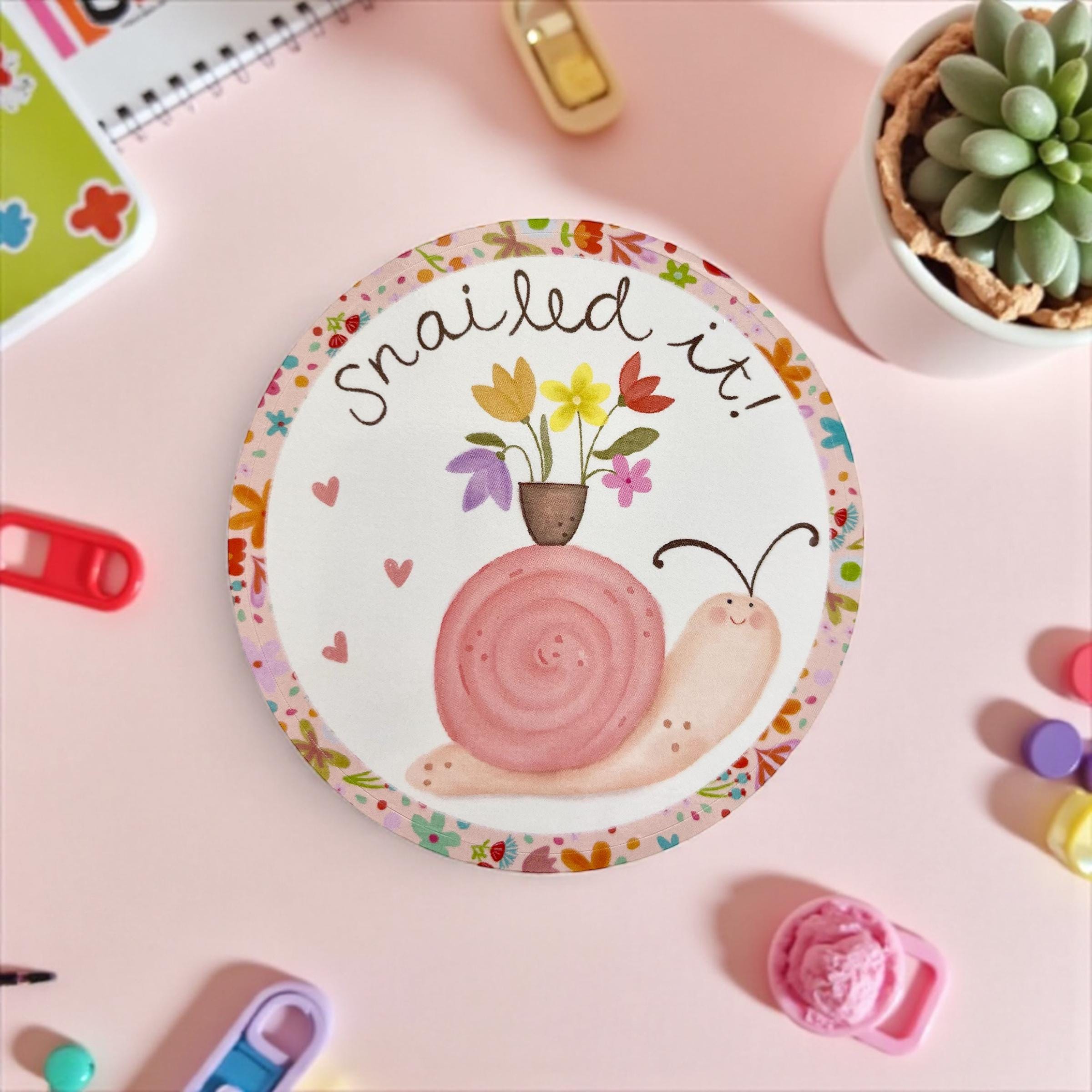 These are a cute way to personalise your stuff! 7.6 cm round “Snailed It” sticker or decal. Professionally printed on thick vinyl with a glossy finish. These come backed onto white paper for easy peeling.