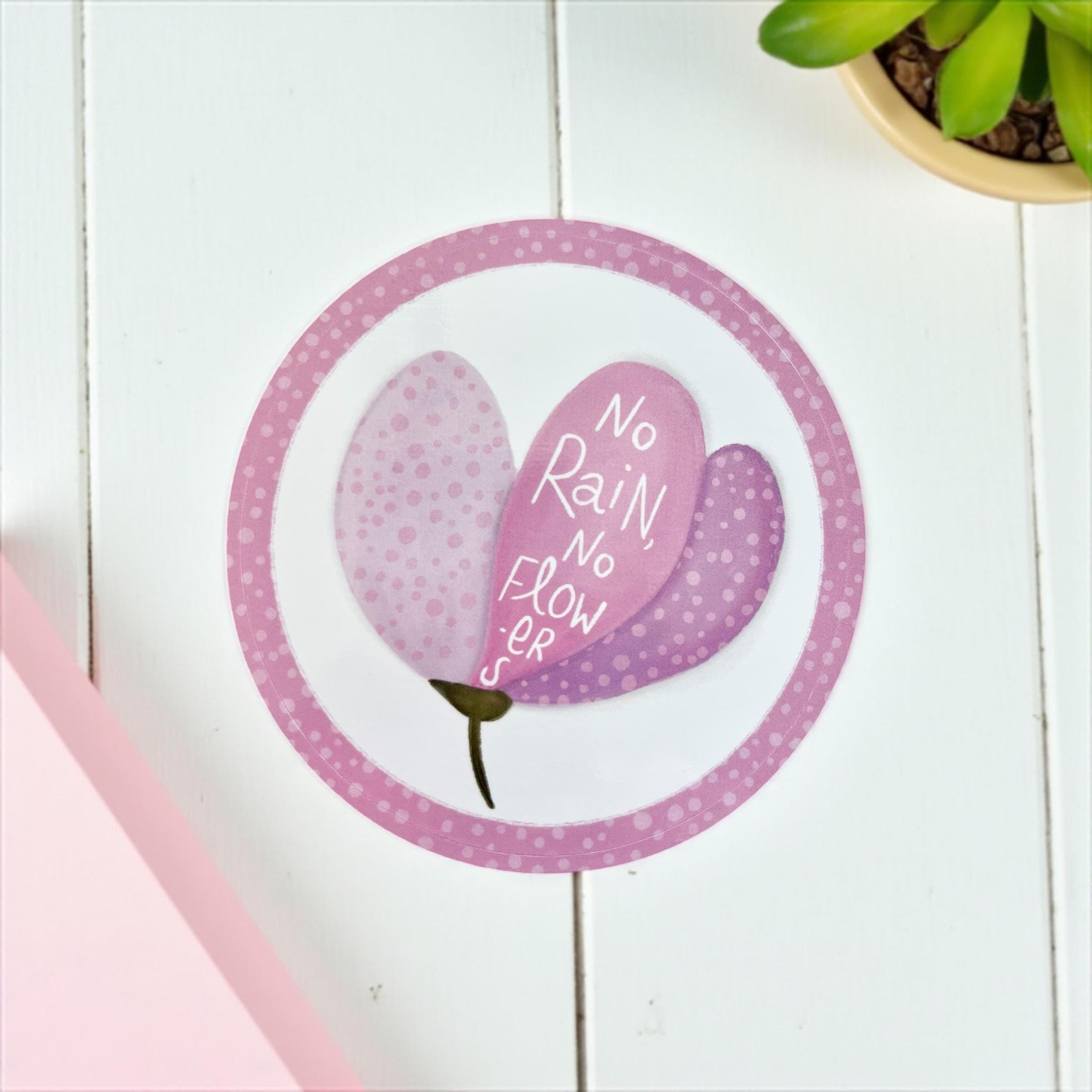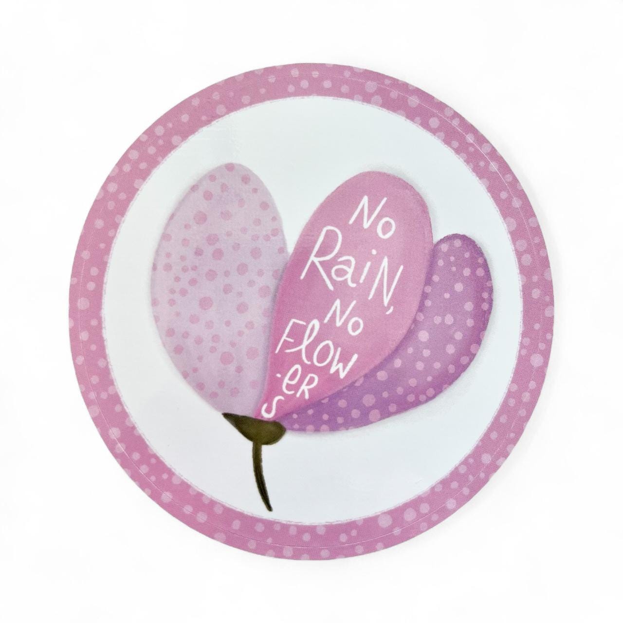 These are a cute way to personalise your stuff! 7.6 cm round “No Rain No Flowers” sticker or decal. Professionally printed on thick vinyl with a glossy finish. These come backed onto white paper for easy peeling.