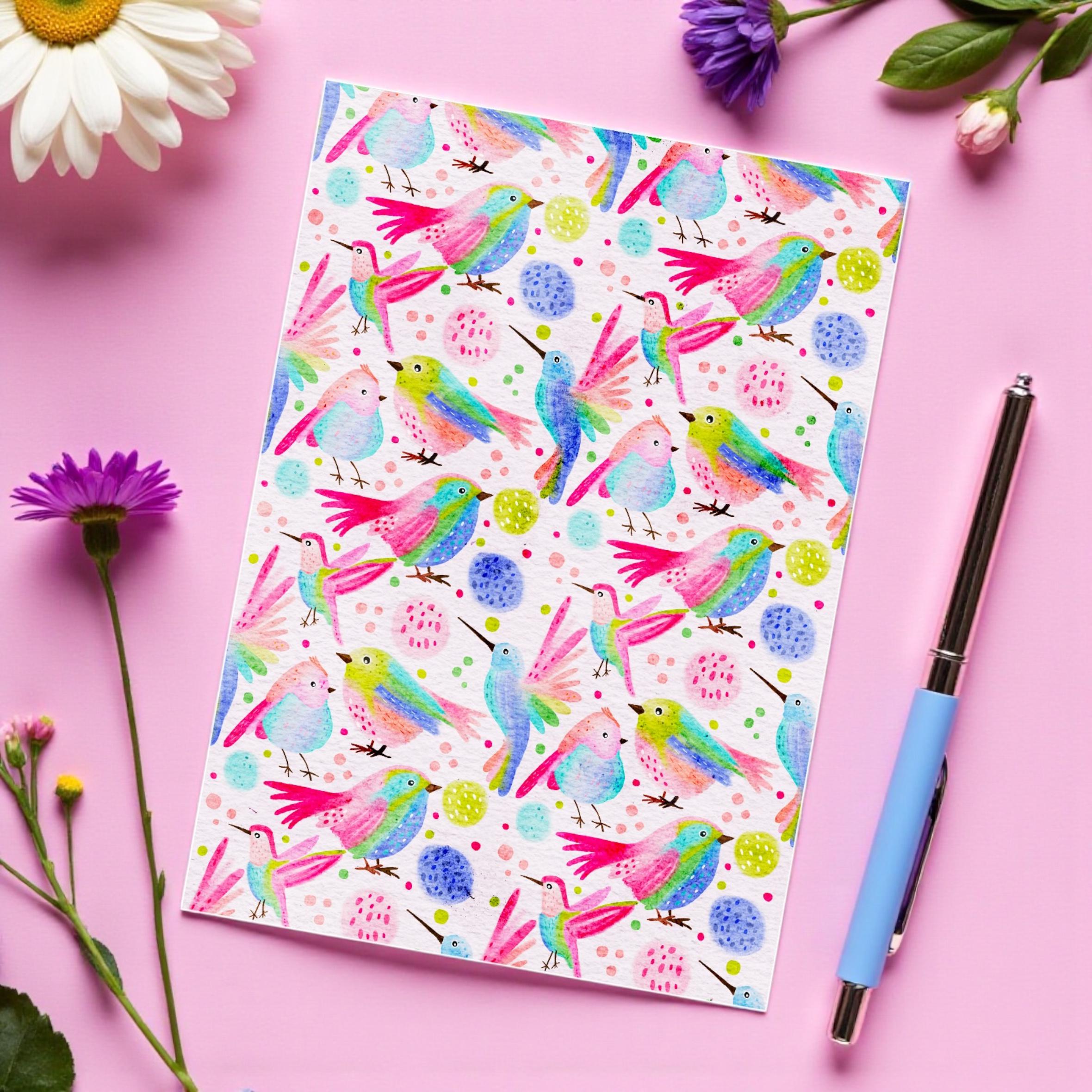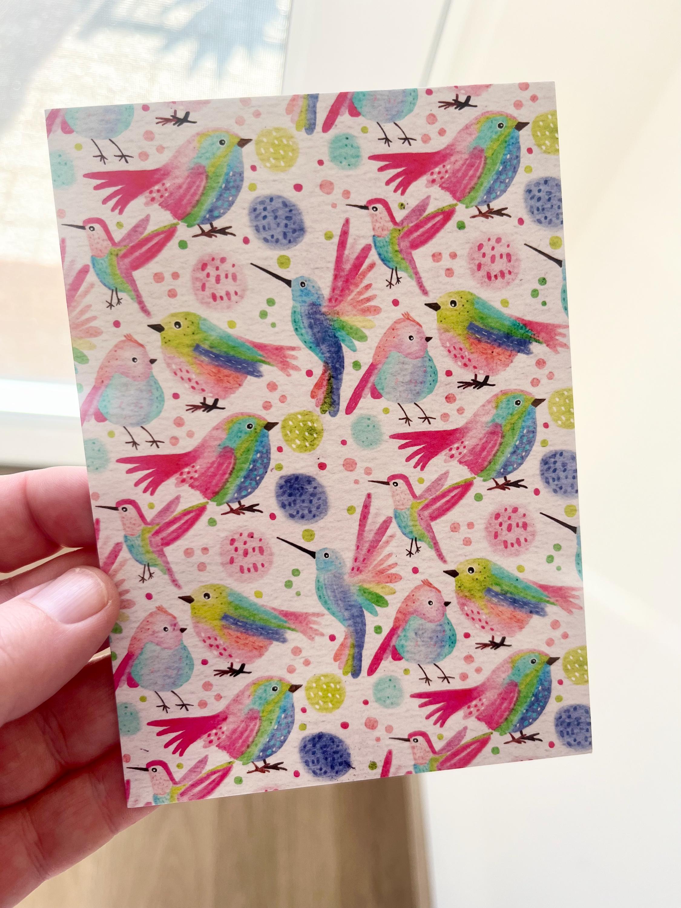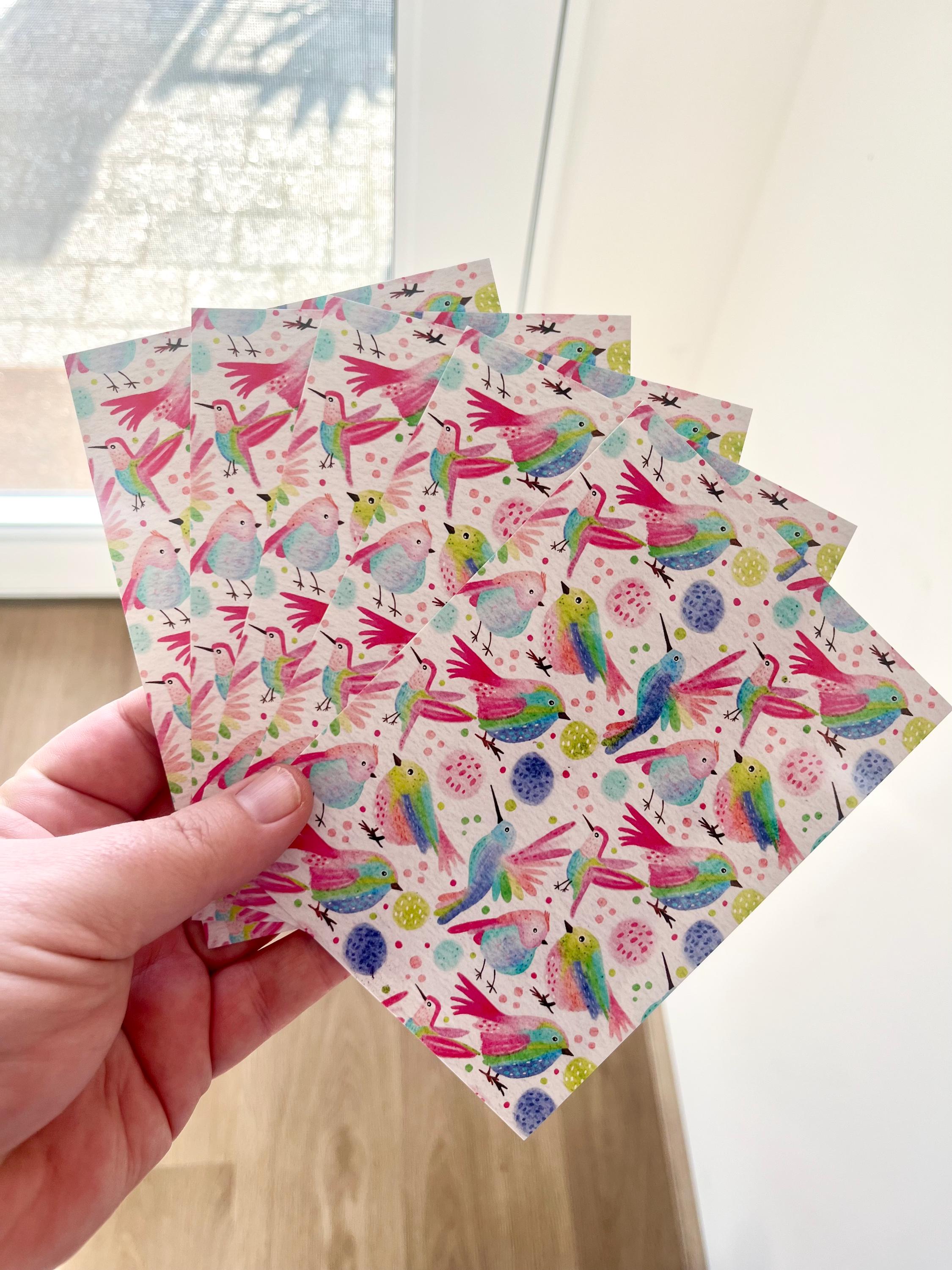Professionally printed on 350gsm card, these bright and colourful notecards / postcards feature little illustrations of beautiful birds. They are a lovely way to jot down some words for a friend, share a recipe or write a to-do list, reminders or notes to the kids or significant other. Handy to have a set on your desk at home or at work.