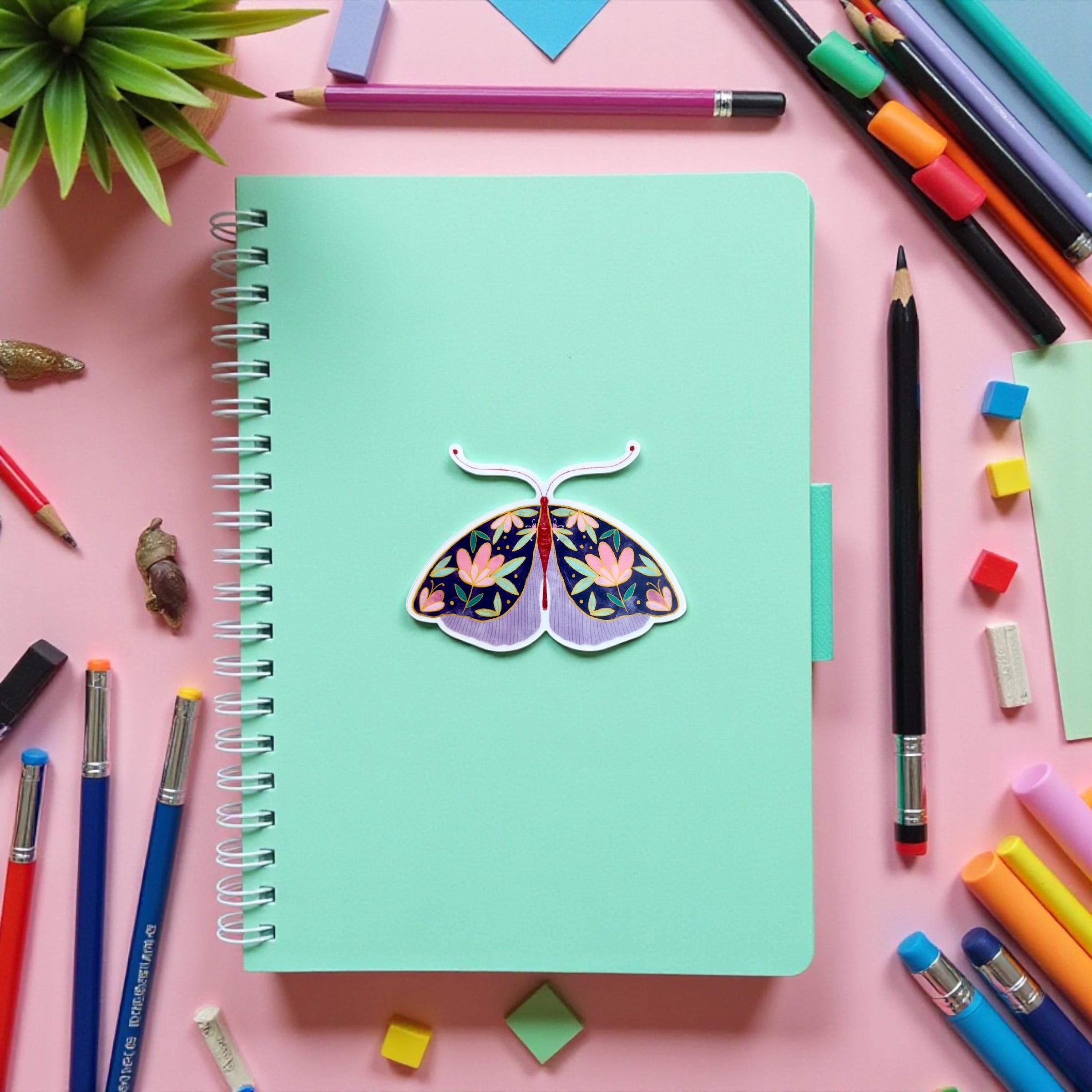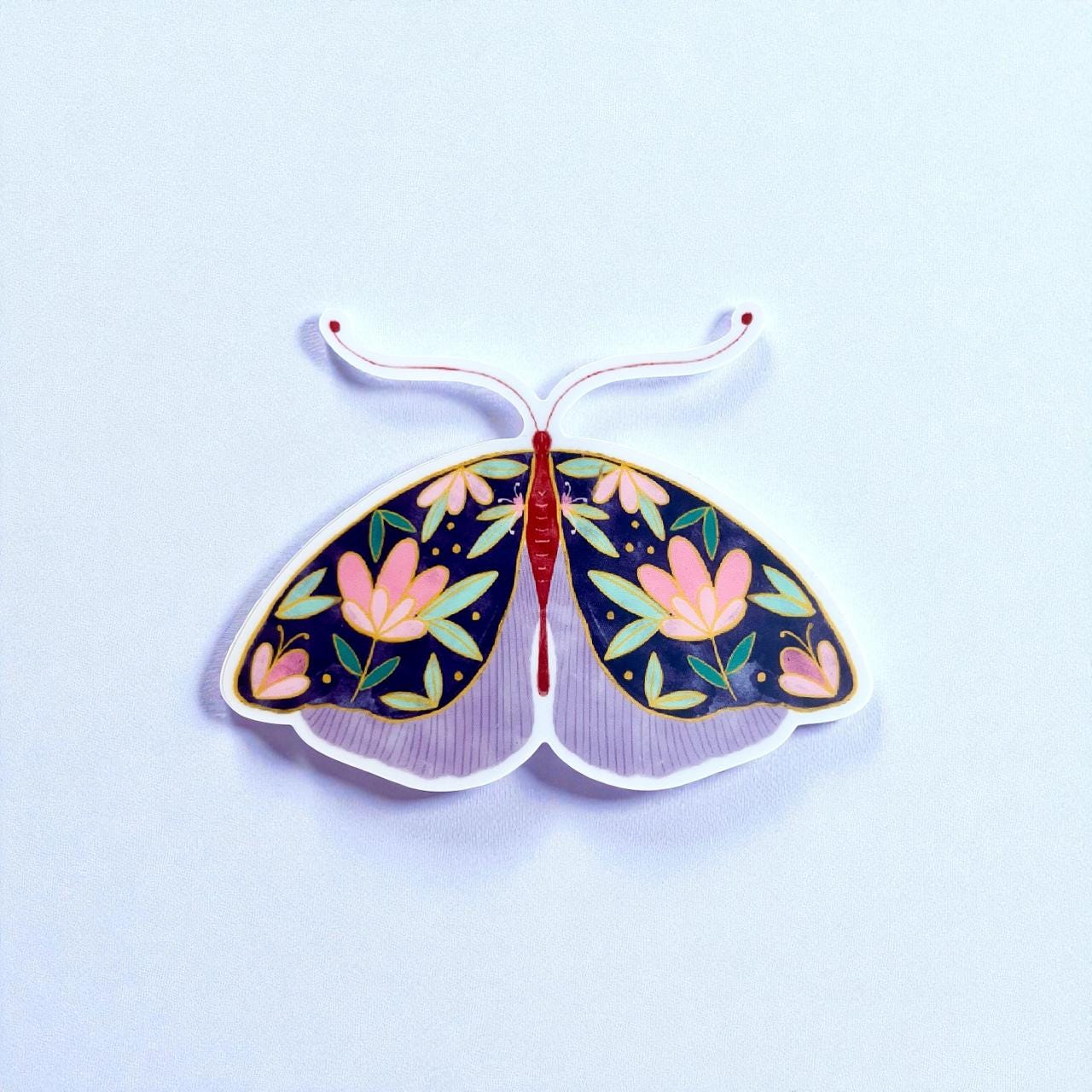 Add a touch of whimsical elegance to your belongings with this hand-illustrated navy moth vinyl sticker! Featuring delicate pink flowers in a symmetrical design, this permanent sticker is perfect for laptops, water bottles, notebooks, phone cases, and more. Its vibrant colors and intricate illustration make it a standout decorative accent for any surface.