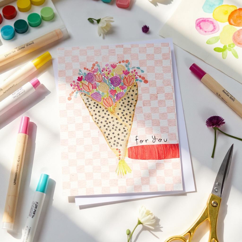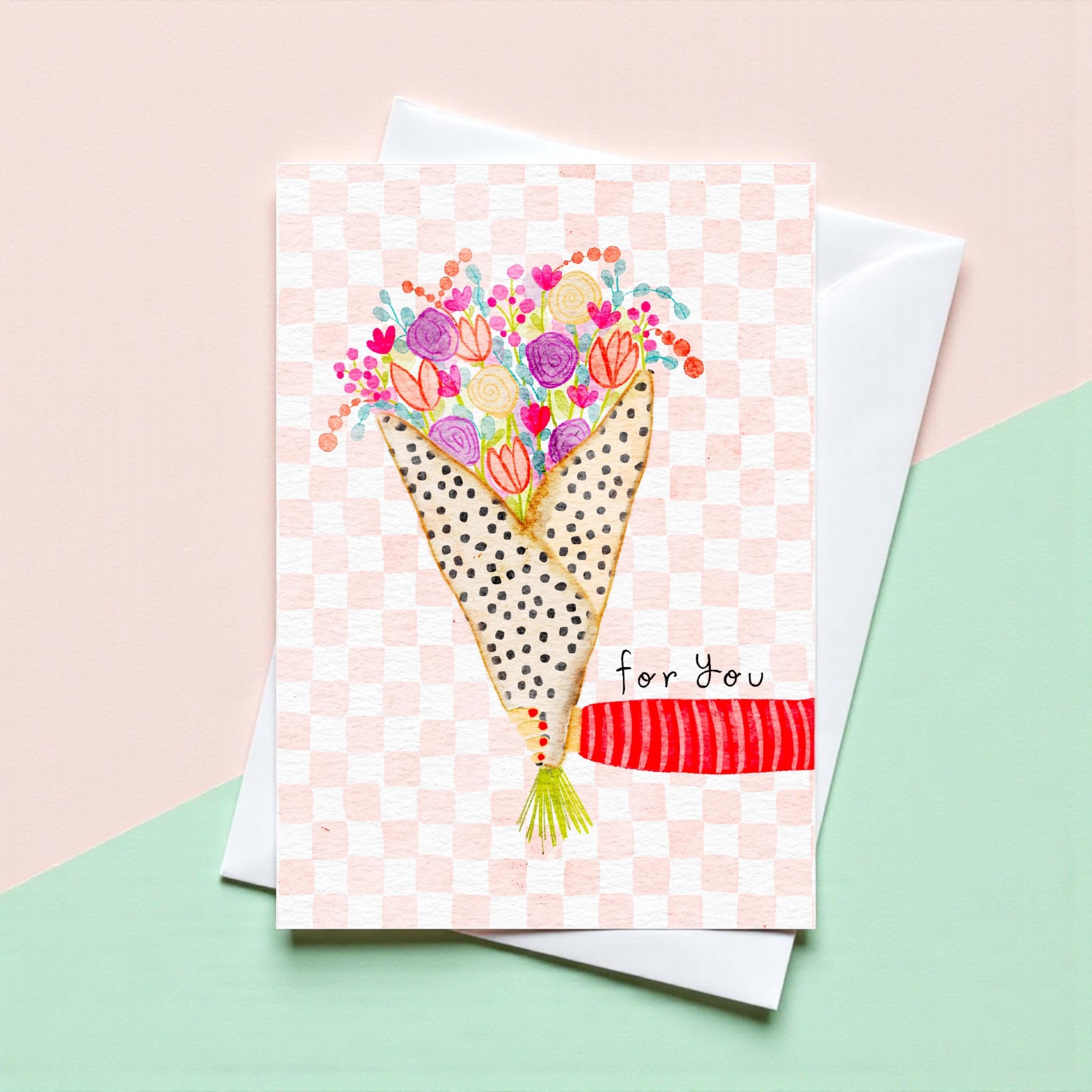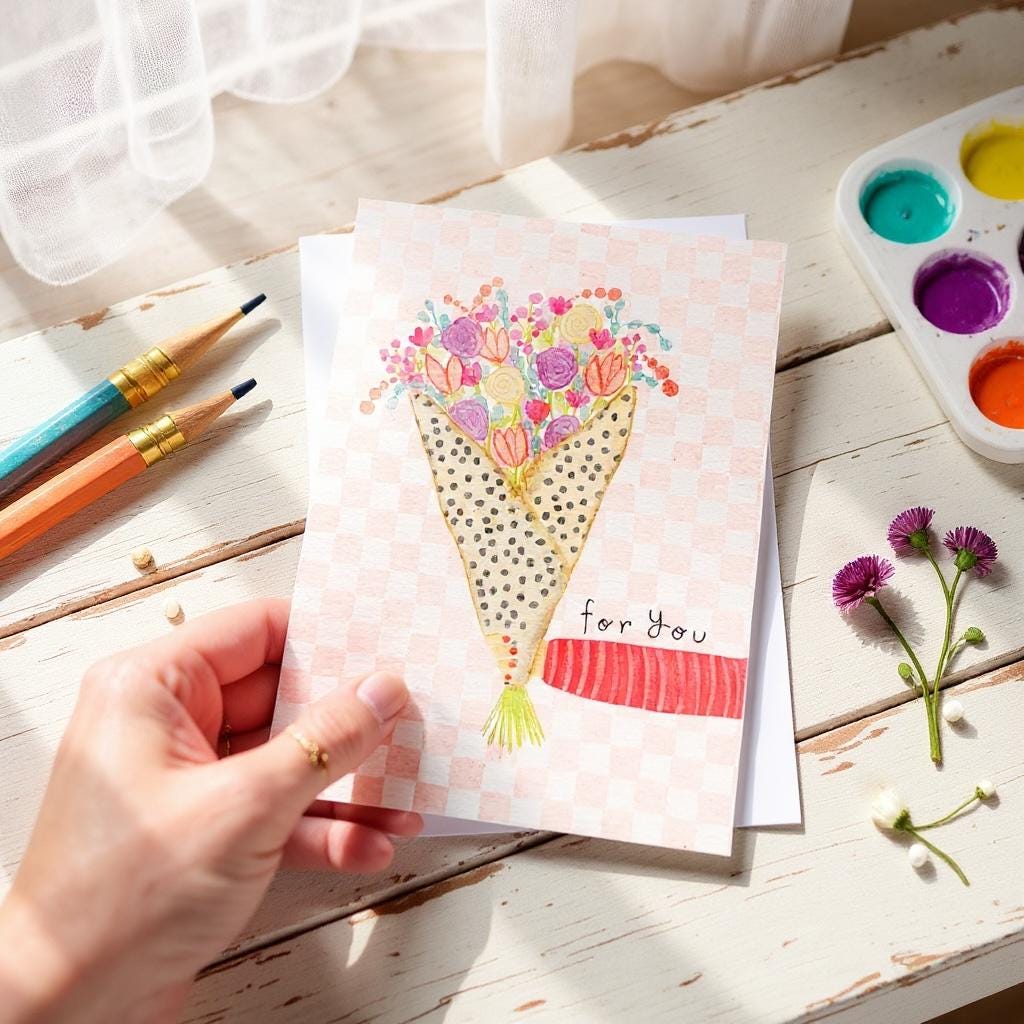 Send a little joy with this beautifully hand-illustrated greeting card! Featuring a delicate hand holding a large bouquet of soft pastel flowers wrapped in stylish black-and-white polka-dotted paper, this card carries the simple, heartfelt message: For You. Perfect for birthdays, thank-yous, or just-because moments, it’s a charming way to show someone you care.