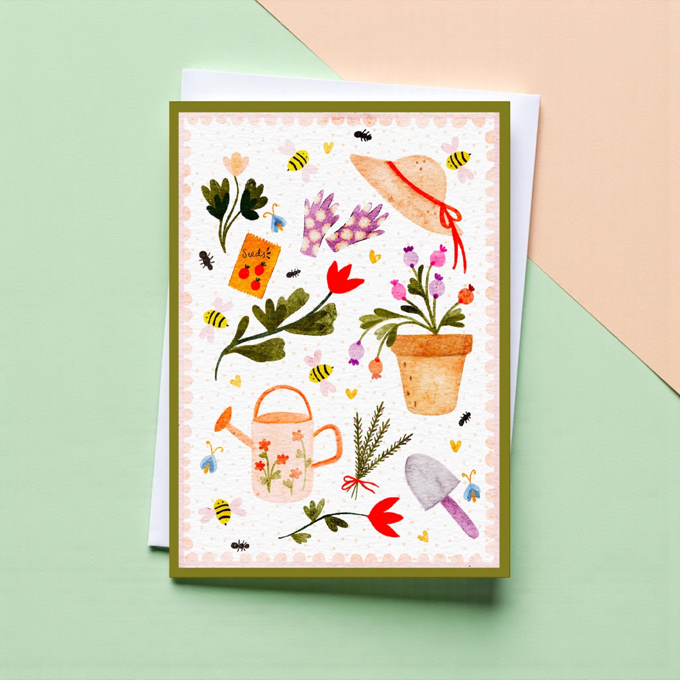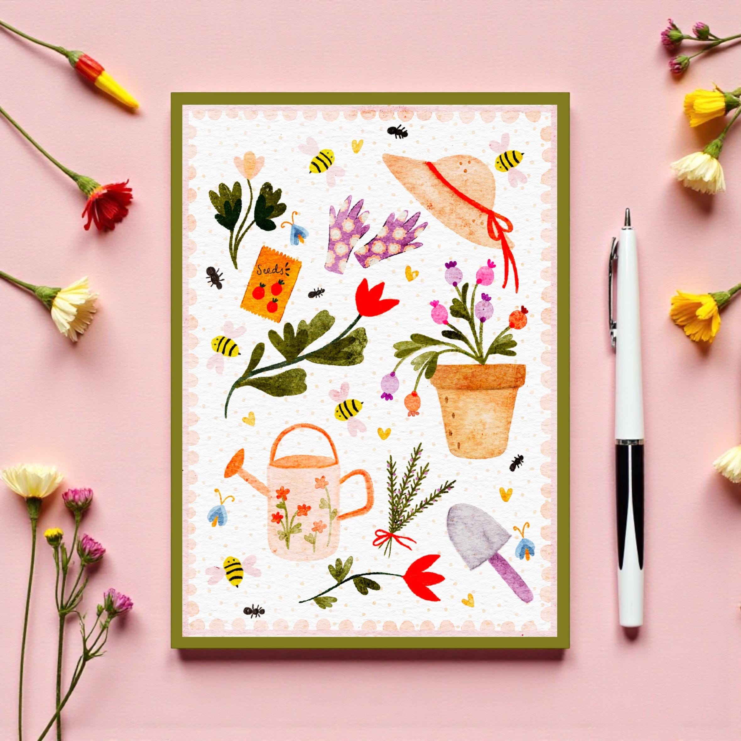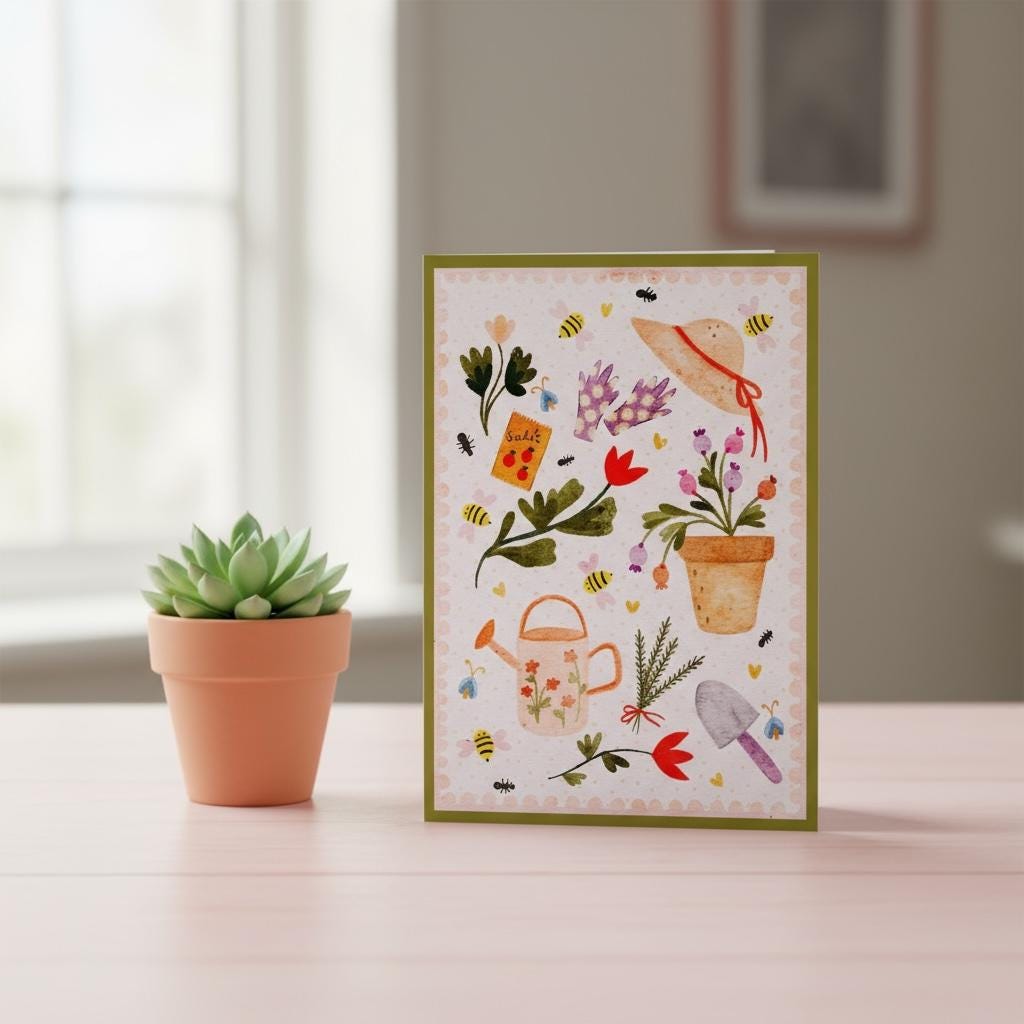 Brighten a gardener’s day with this charming hand-illustrated greeting card! Bursting with flowers, leafy plants, spades, gloves, and a cheerful watering can, it’s perfect for birthdays, thank-yous, or just-because notes. Each card is lovingly illustrated and printed on high-quality cardstock, ready to gift or post. Show a little love for the green thumbs in your life!