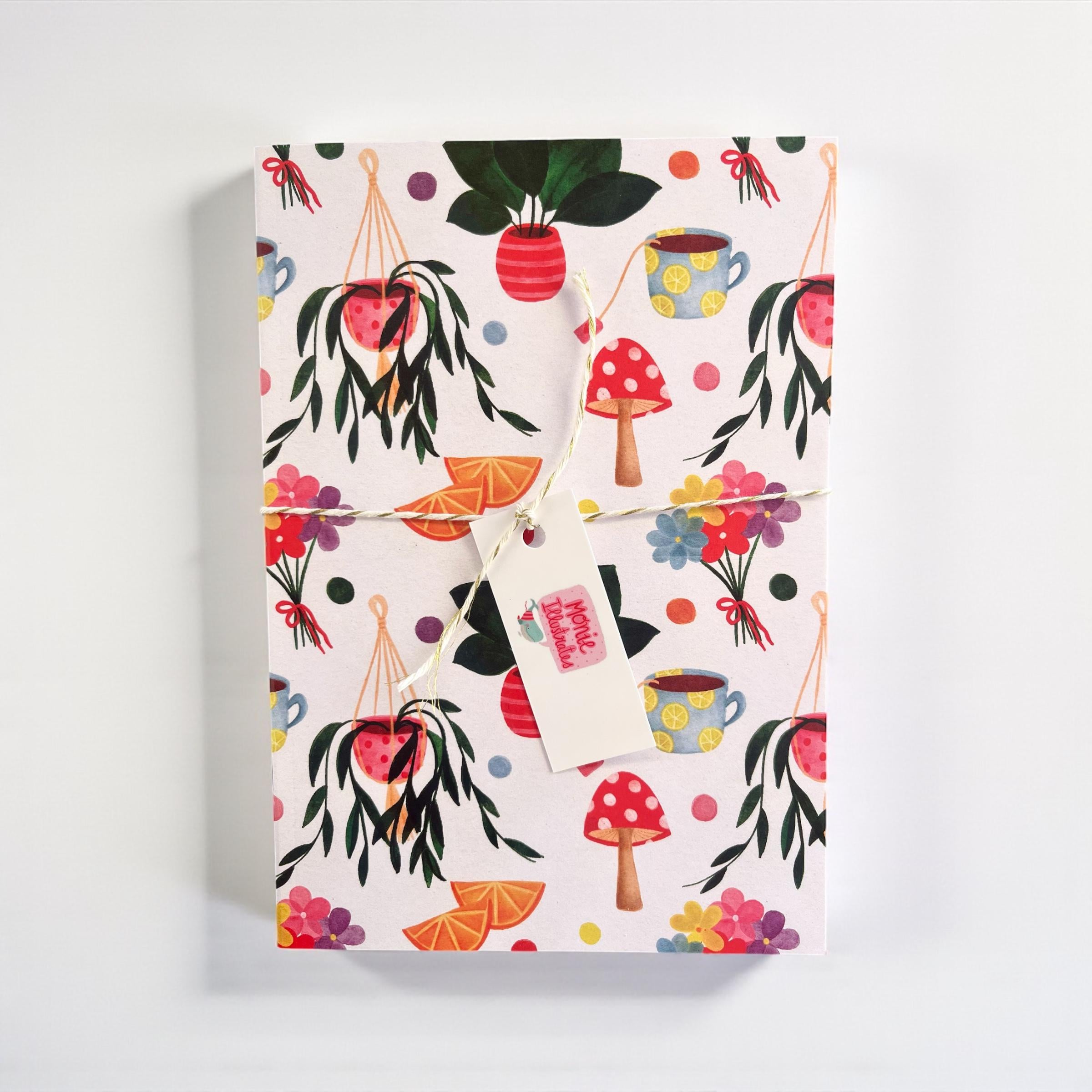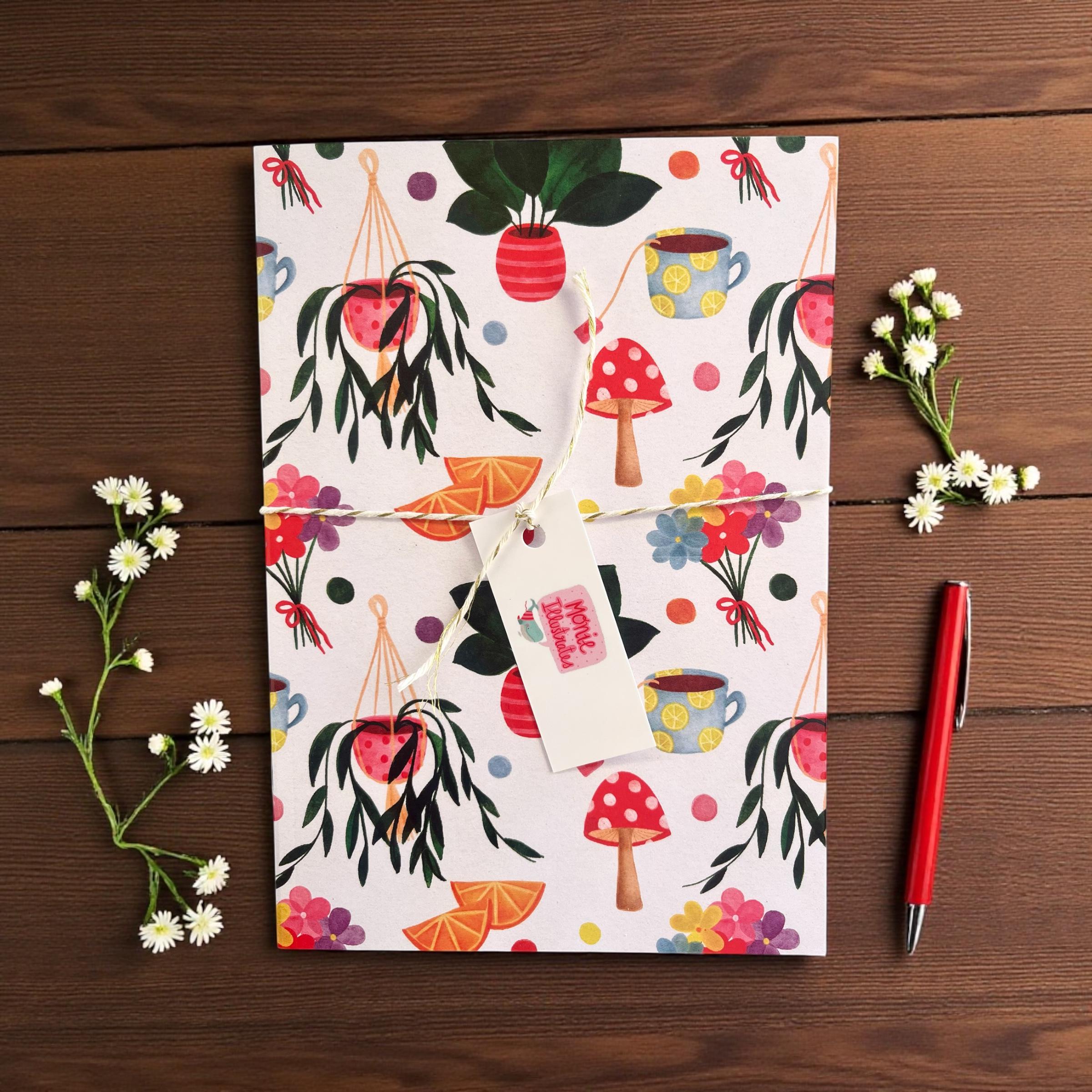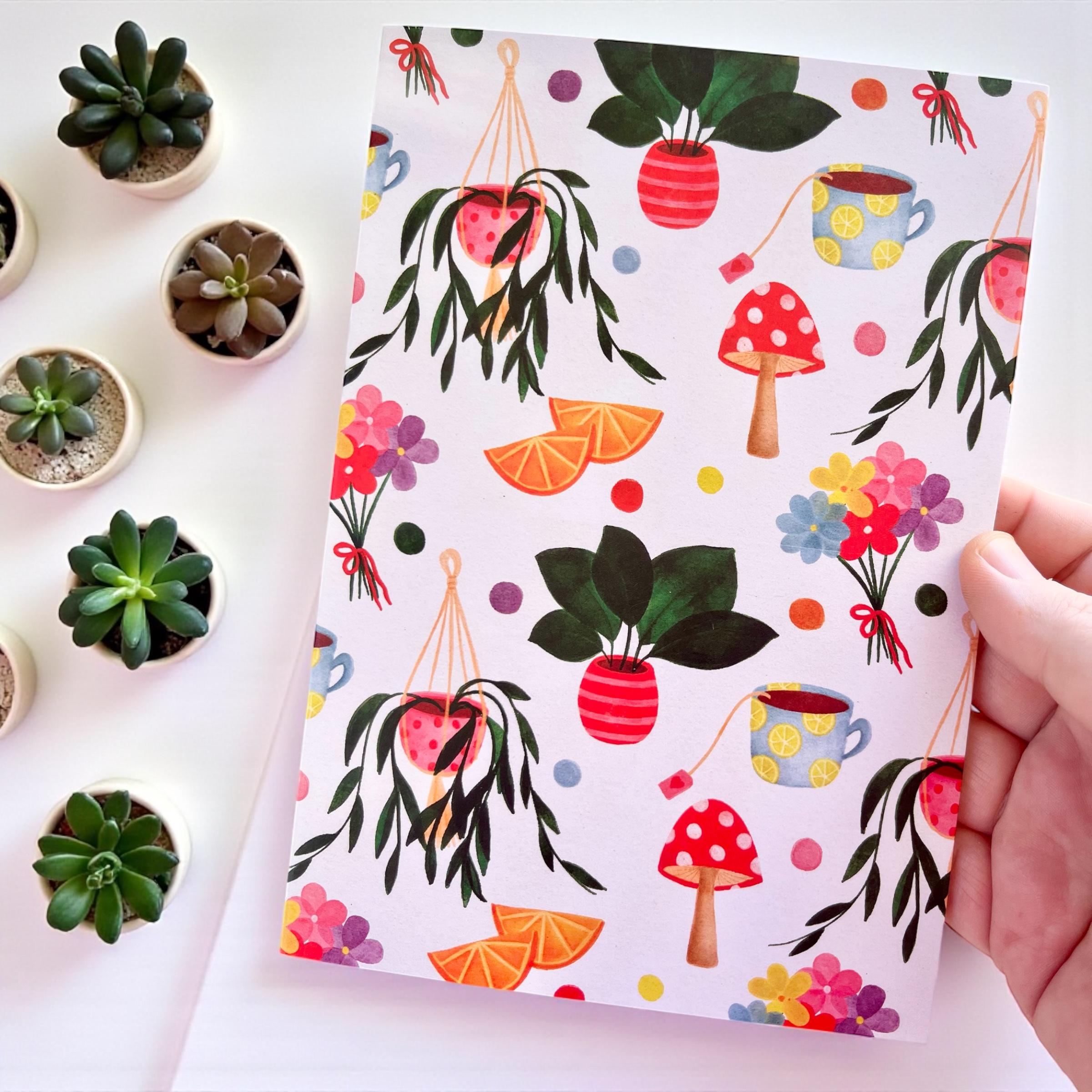 Celebrate the simple joys of life with this handmade A5 notebook featuring my original “Celebrate the Everyday” seamless pattern. This cheerful design is filled with flowers, mushrooms, tea cups, oranges, plants and playful polka dots — a warm reminder to find beauty in the little things.