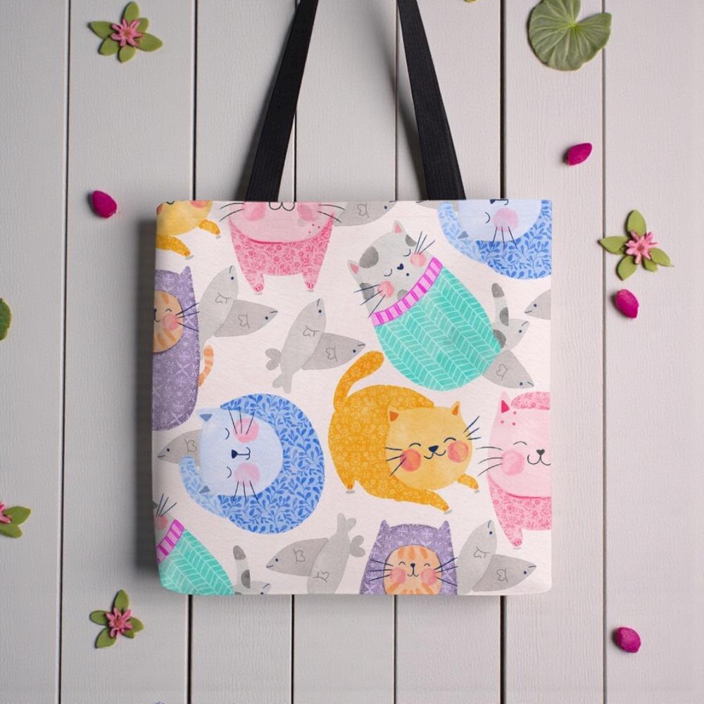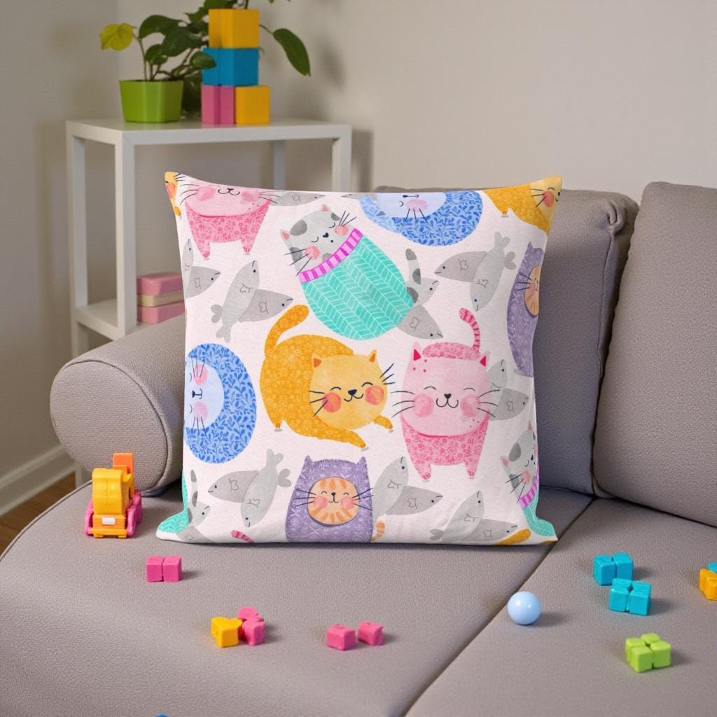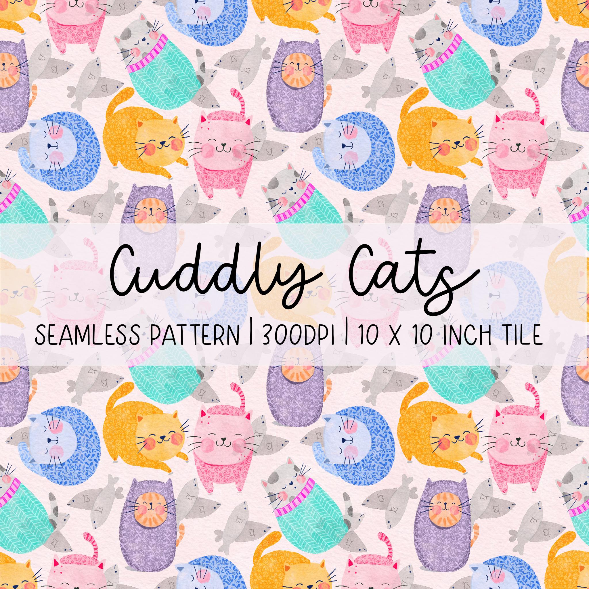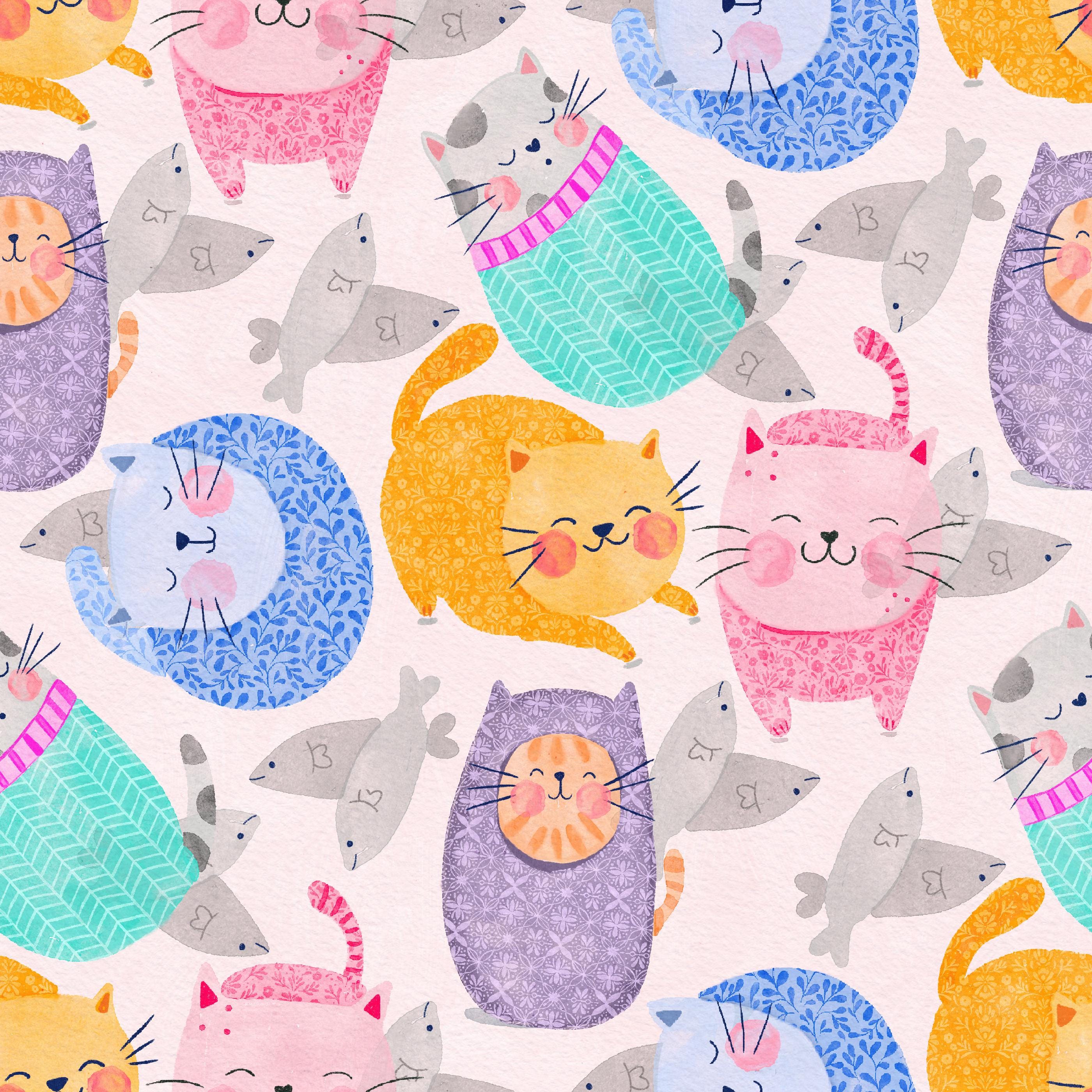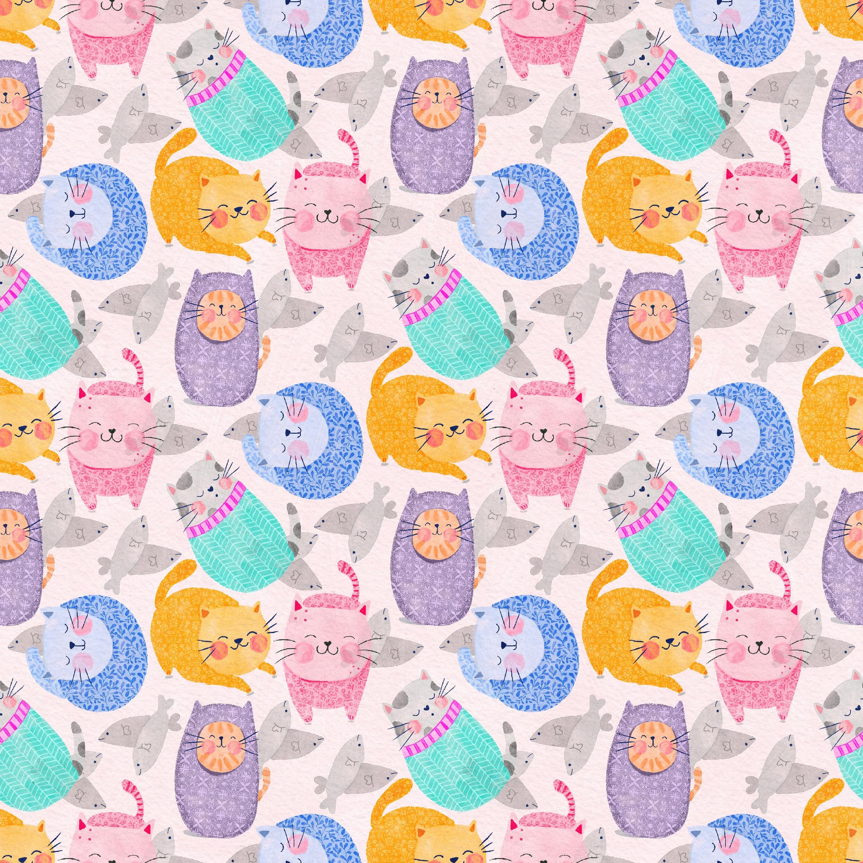 Bring a playful touch to your creative projects with this hand-illustrated digital pattern featuring a parade of patterned cats in pink, purple, aqua, orange, and blue. Perfect for surface design, fabric printing, scrapbooking, digital art, packaging, and crafts, this bright and whimsical design is ideal for artists and makers who love colour and character.