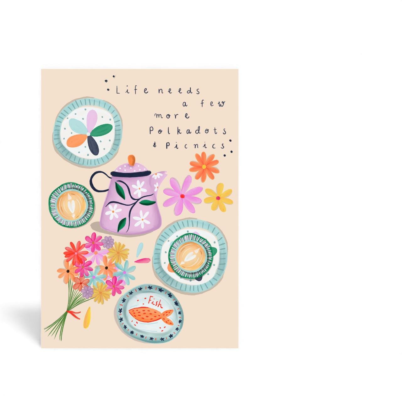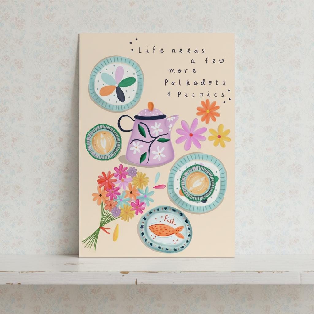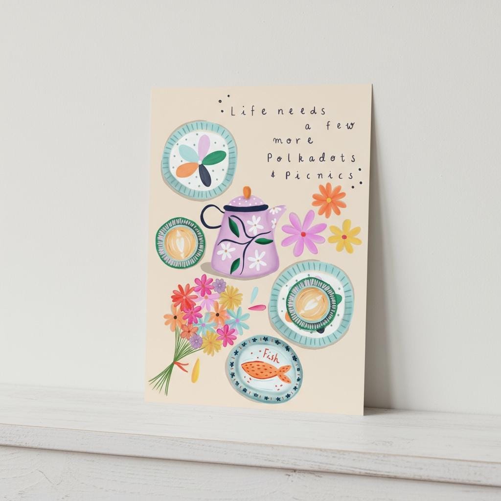 Add a touch of cheerful whimsy to your home with this A5 illustration print, featuring the uplifting quote “Life Needs a Few More Polkadots and Picnics” paired with a charming picnic scene. Designed to bring warmth, colour, and a sense of nostalgia to any space, it’s perfect for kitchens, studios, bedrooms, or gallery walls.