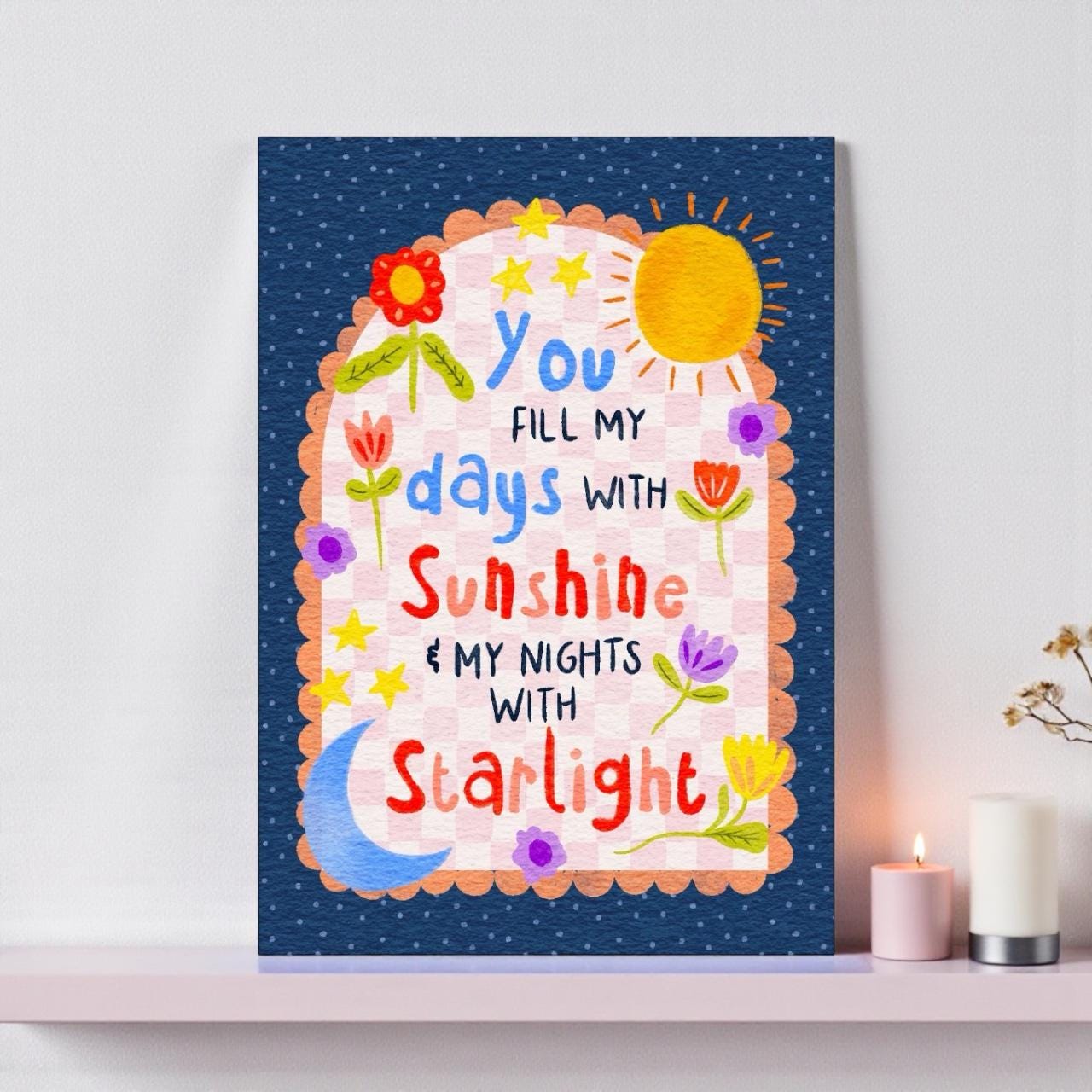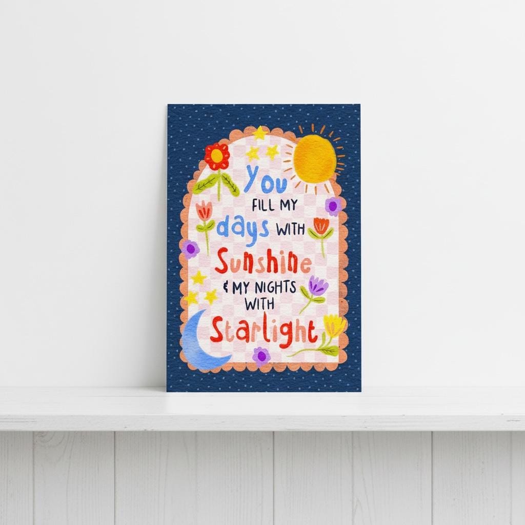 Bring warmth, colour, and positivity to your home with this A5 illustration print, featuring the uplifting quote “You Fill My Days with Sunlight and My Nights with Starlight” in a bright, cheerful floral design. Perfect for displaying on a shelf, desk, or gallery wall, it adds a joyful, uplifting touch to any space.