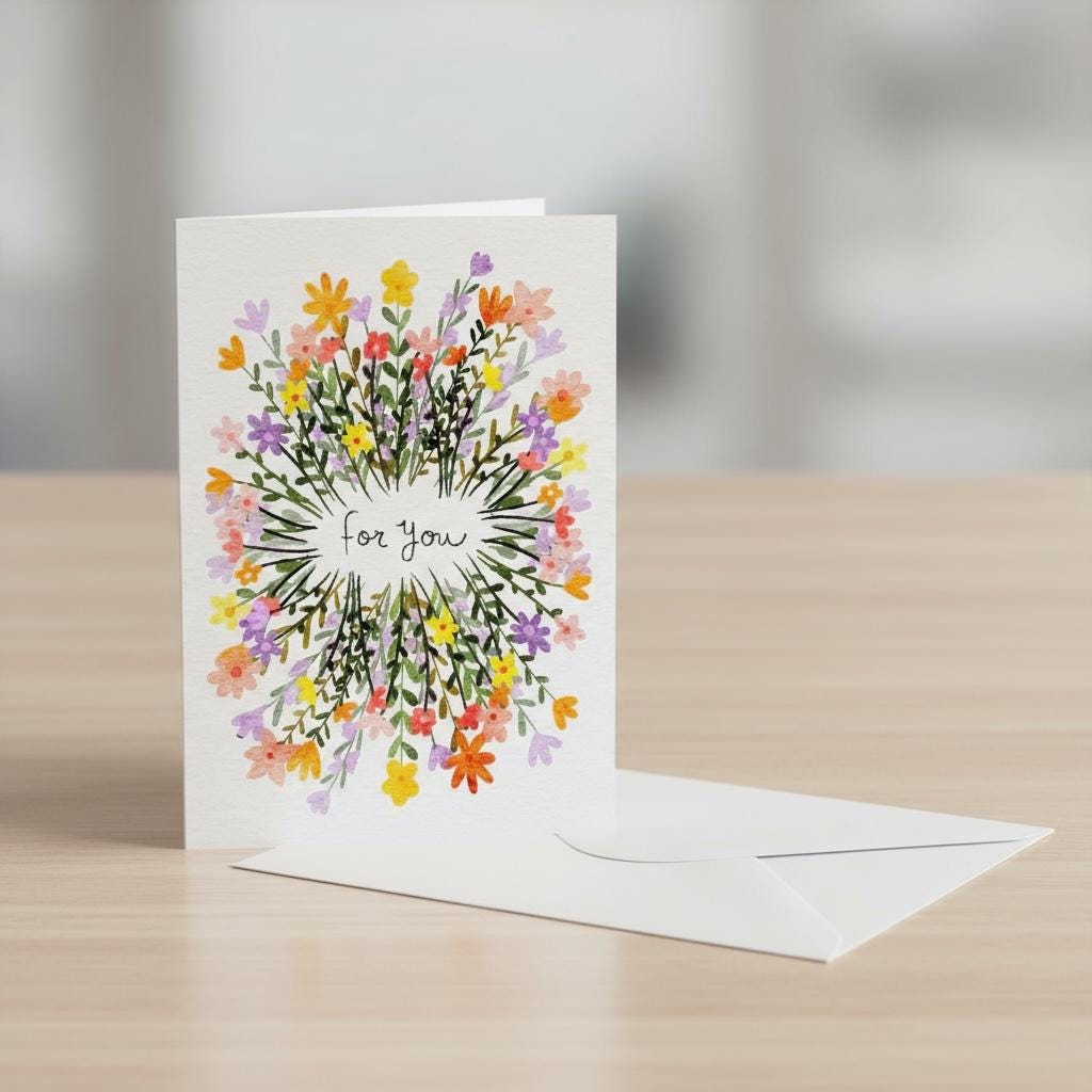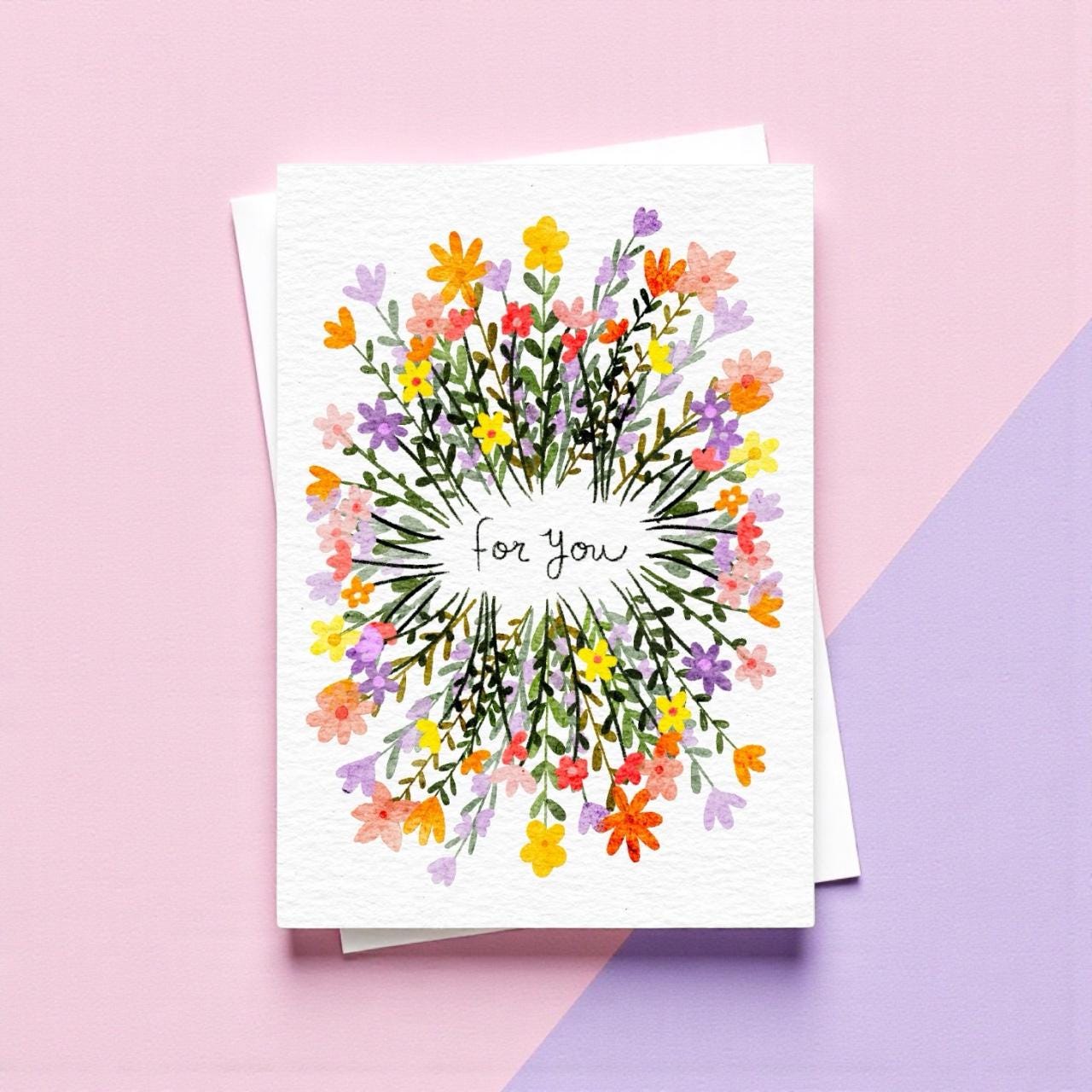 Bright, cheerful, and full of charm — this A6 greeting card features a vibrant floral burst surrounding the words “For You”, making it perfect for birthdays, thank-yous, celebrations, or any moment that deserves a little extra colour.