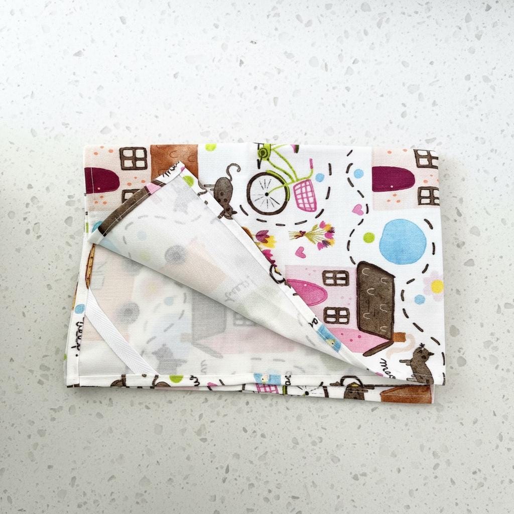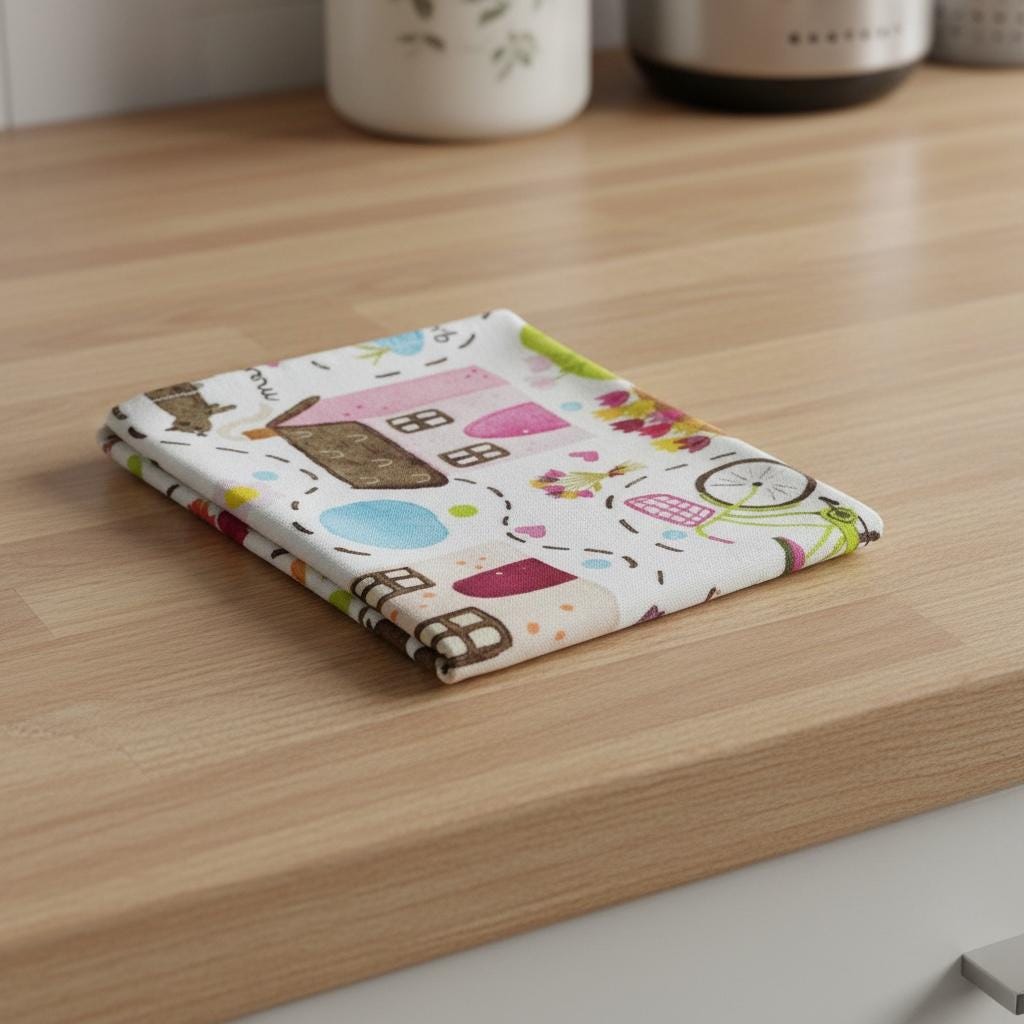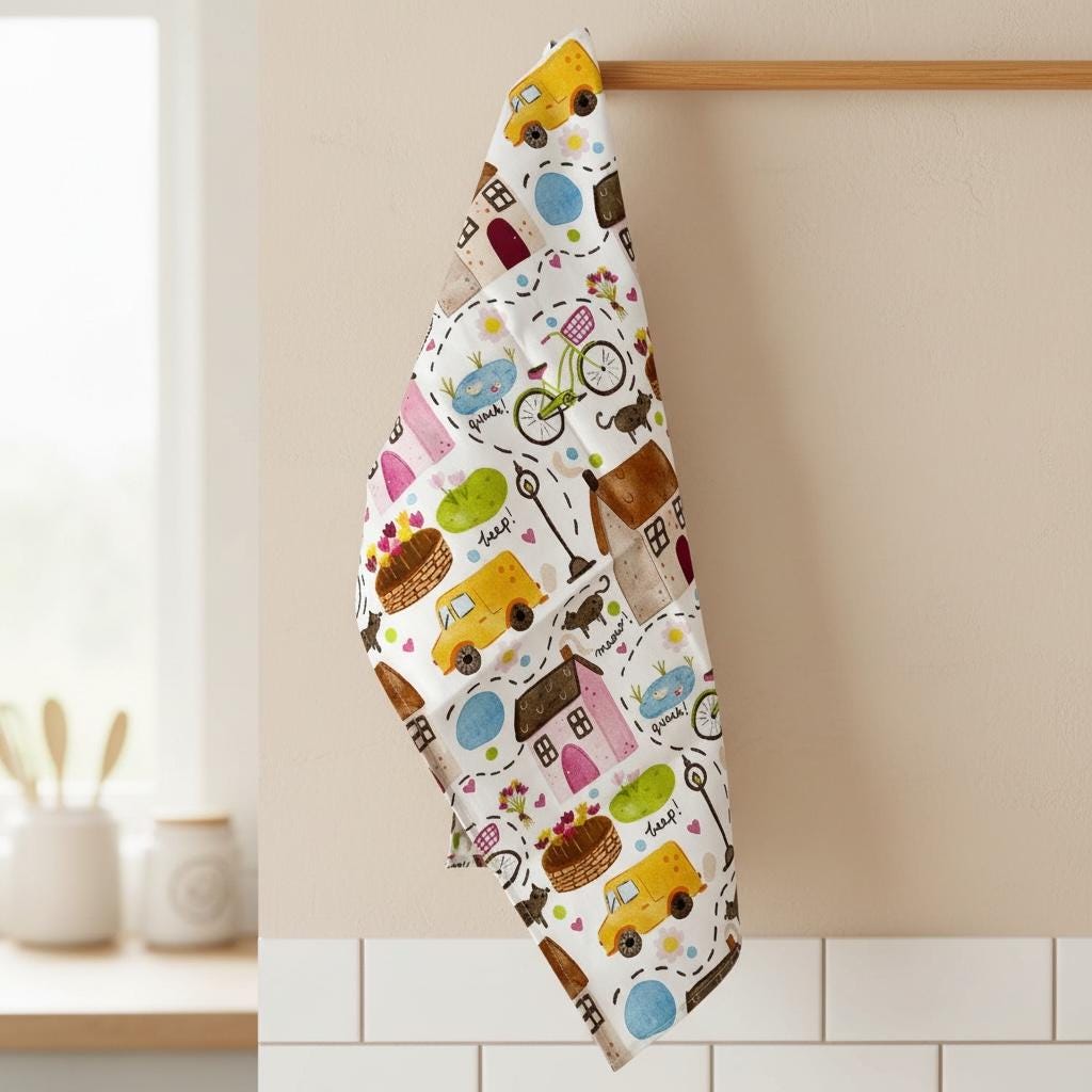 Bring a touch of hand-illustrated charm to your kitchen with this beautiful tea towel featuring my “My Neighbourhood” pattern. Each towel is professionally sewn and printed with crisp detail, showcasing a design inspired by neighbourhood motifs.
