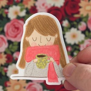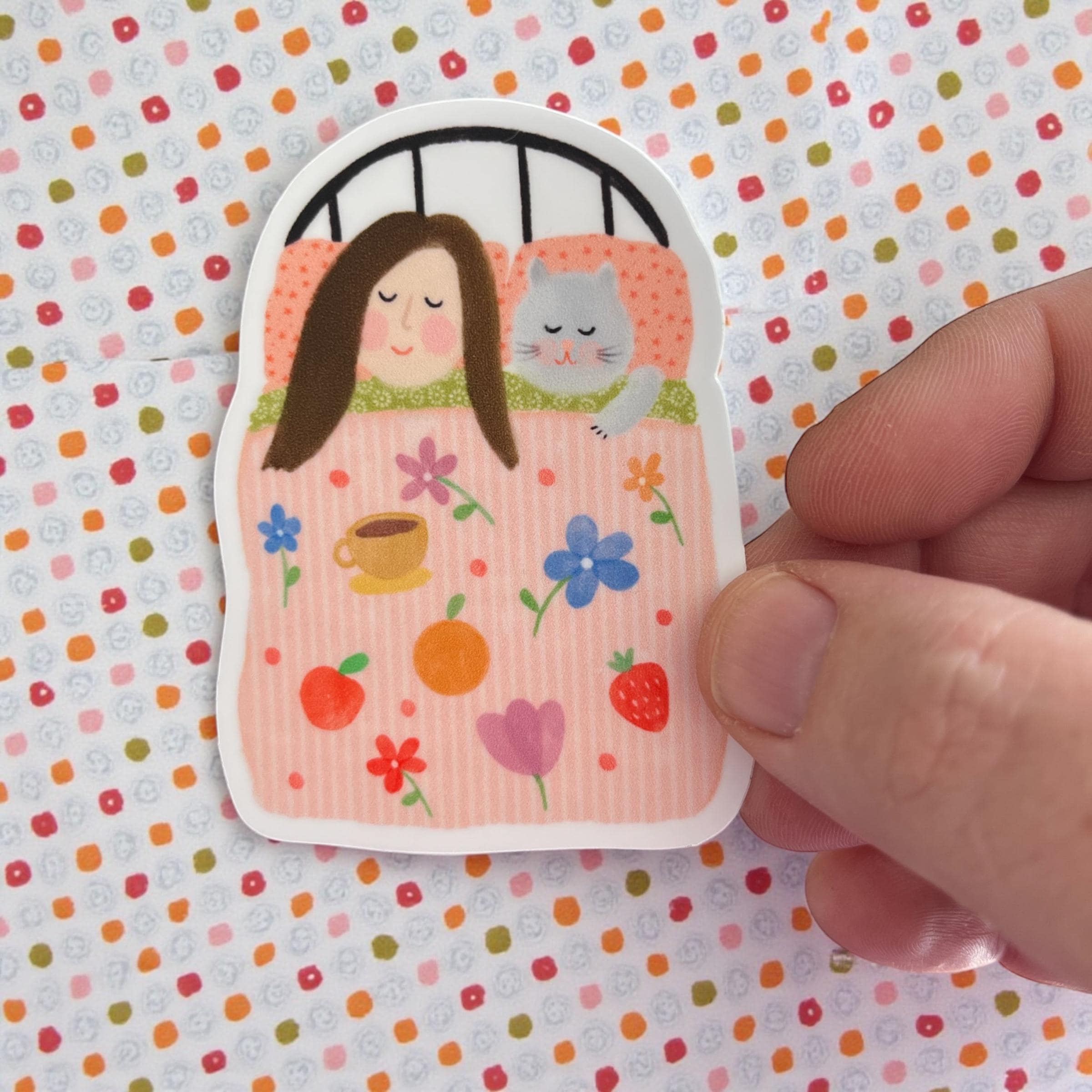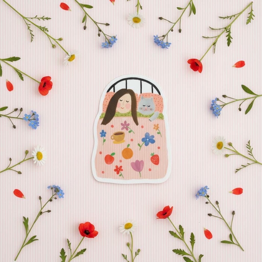 A beautiful, thick, vinyl sticker / decal featuring my Tucked up in Bed illustration.
