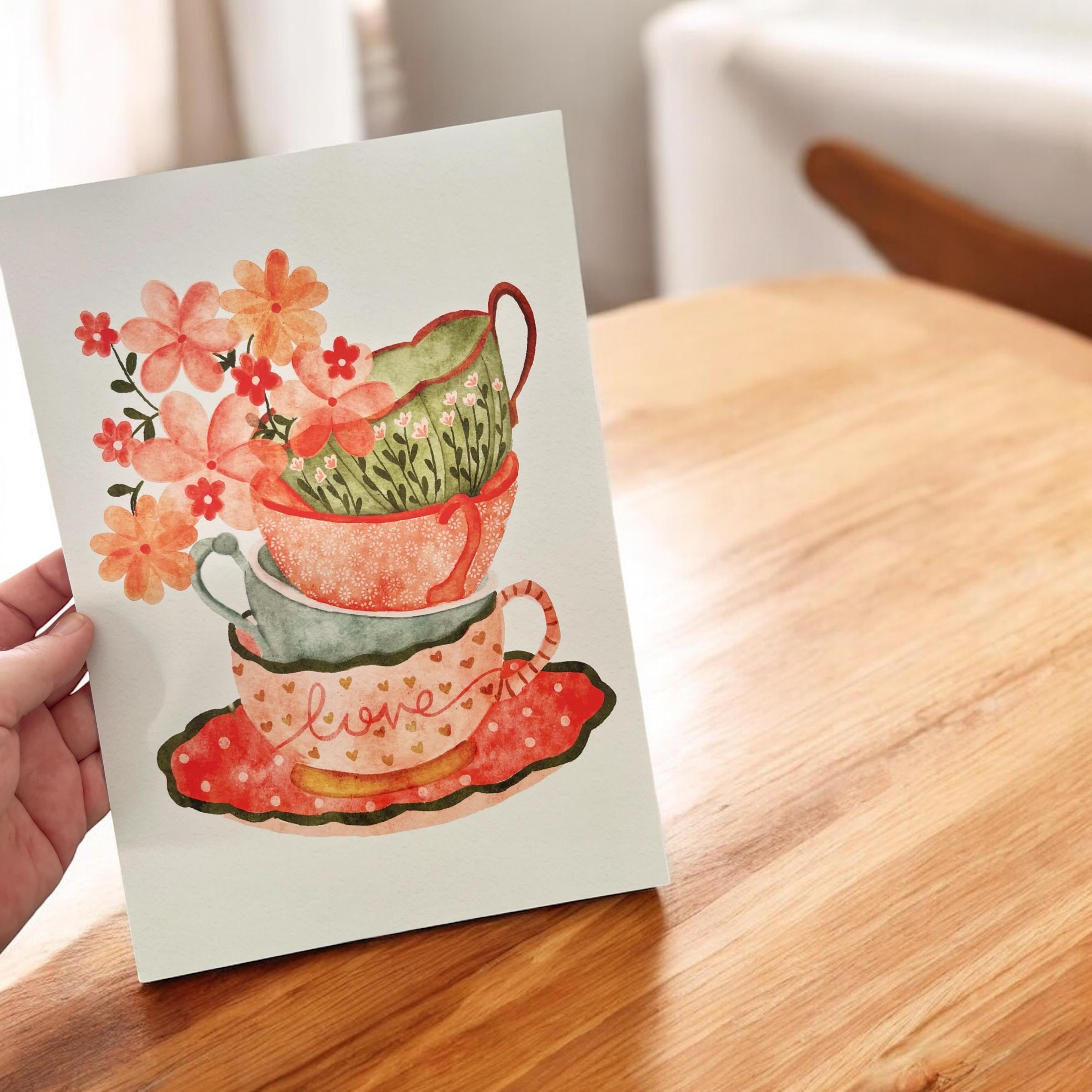 Bring charm and warmth to your space with this A4 artist print featuring a whimsical hand-illustrated series of stacked teacups. Filled with delicate details and a cosy, homely feel, this artwork adds a gentle touch of comfort to any room.