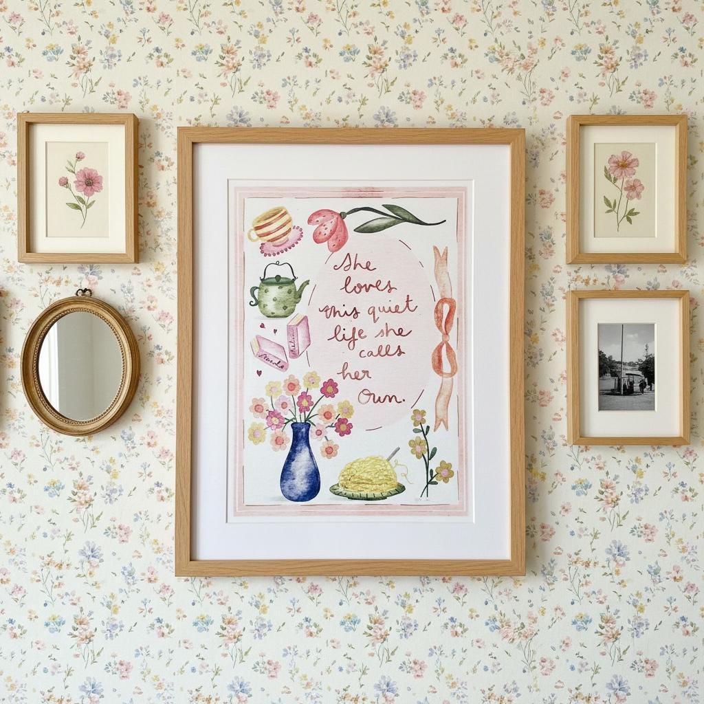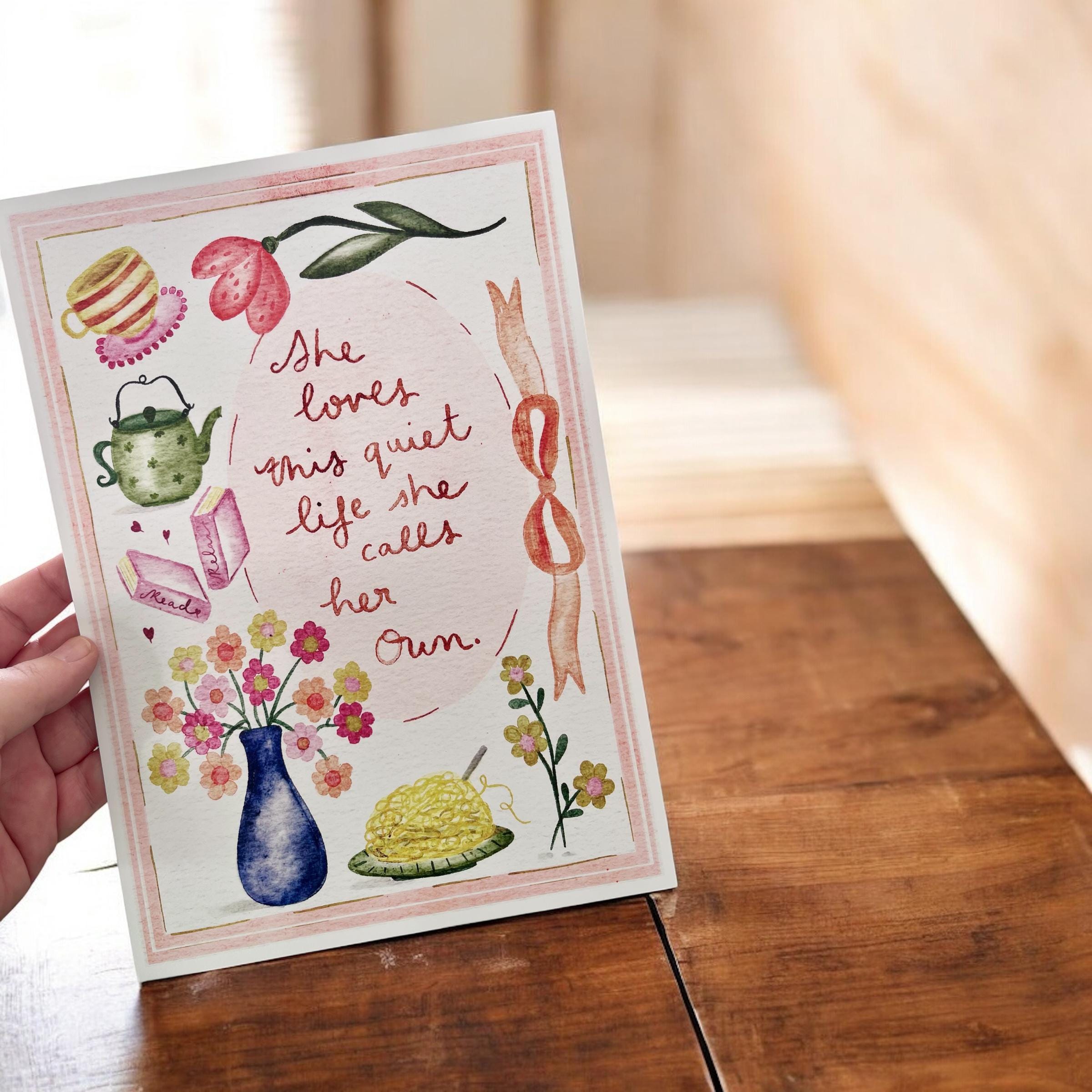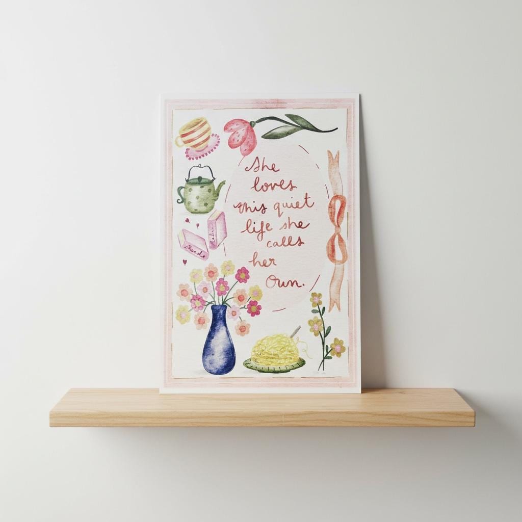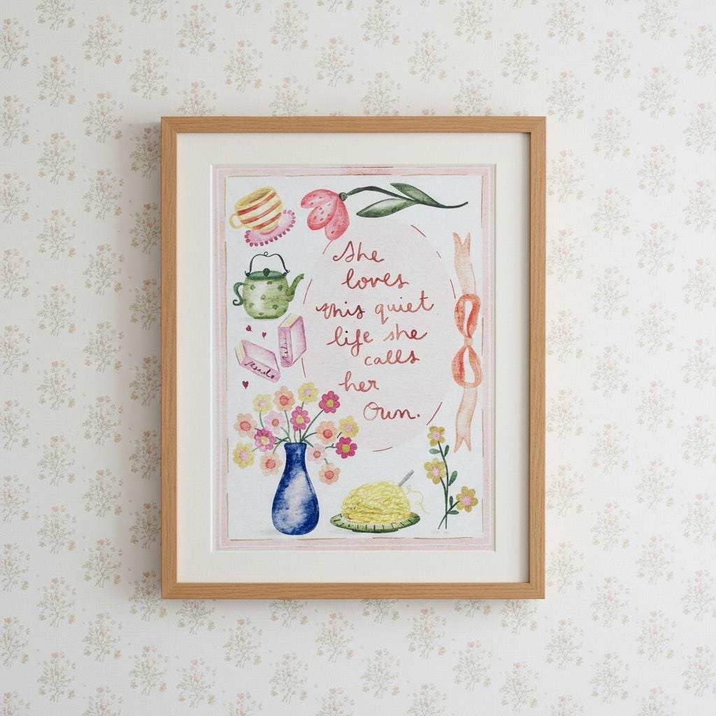 Bring a sense of calm and indulgence to your space with this A4 artist print featuring a beautifully hand-drawn illustration inspired by peaceful moments. The artwork features the words “She Loves this Quiet Life she calls her Own,” surrounded by cozy and indulgent elements like tea, books, and pasta, celebrating the little joys that make life special.
