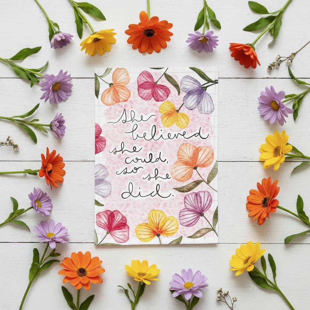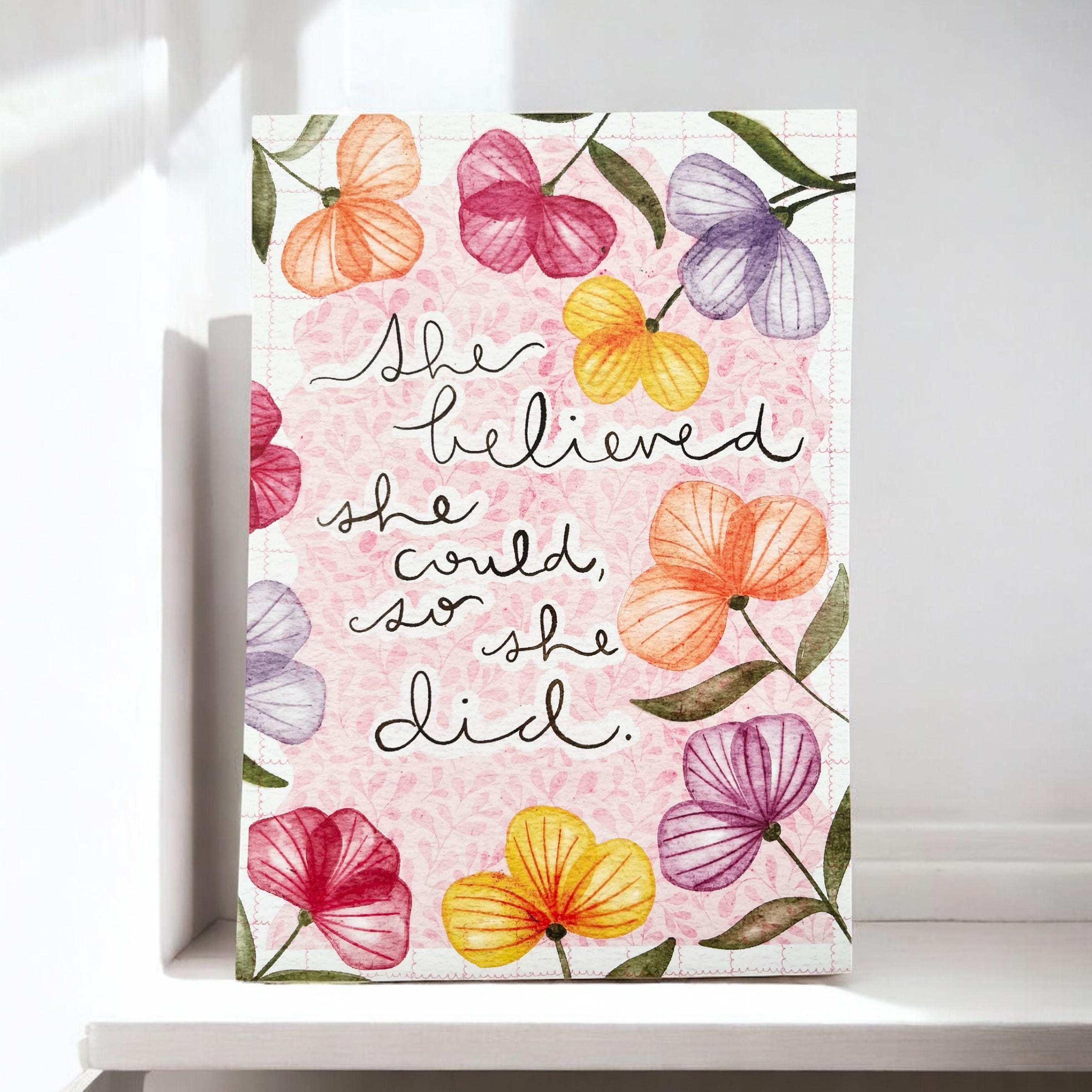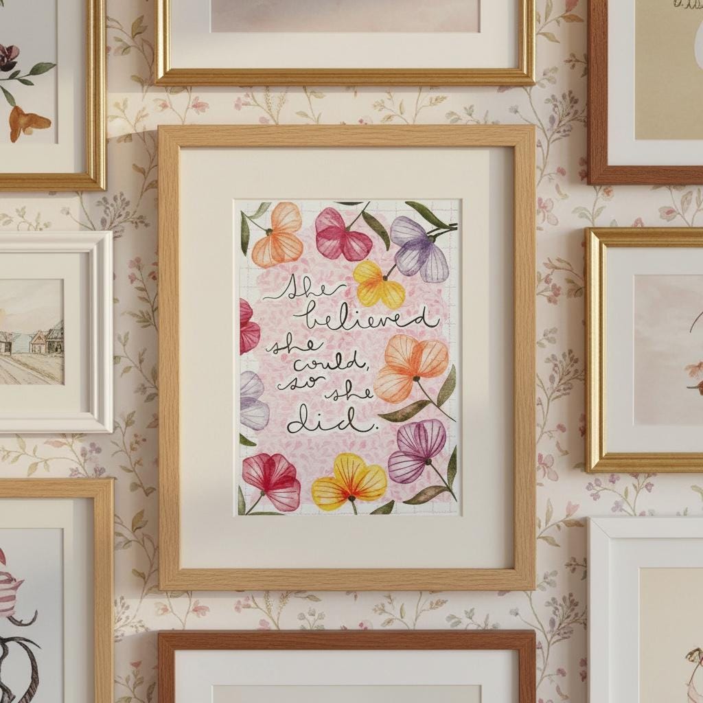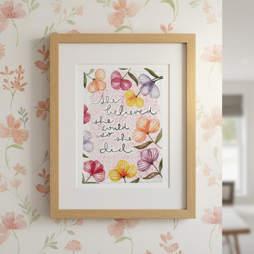Bring motivation and beauty to your space with this A4 artist print featuring the empowering words “She Believed she Could so she did,” surrounded by a delicate hand-drawn floral design. With soft details and a harmonious composition, this artwork adds inspiration and charm to any room.