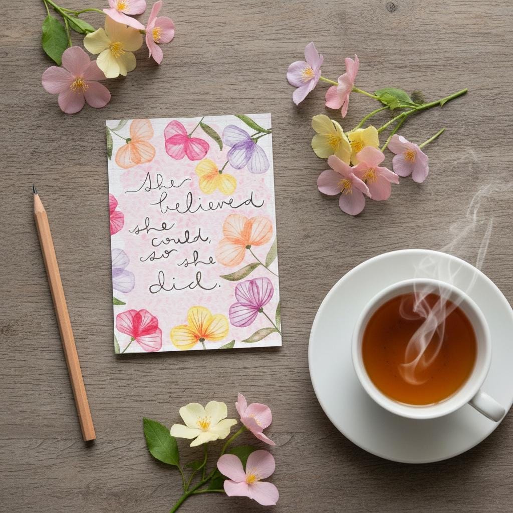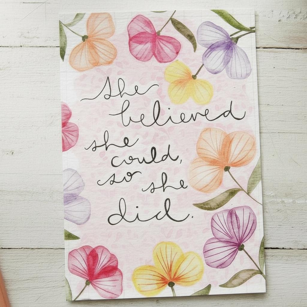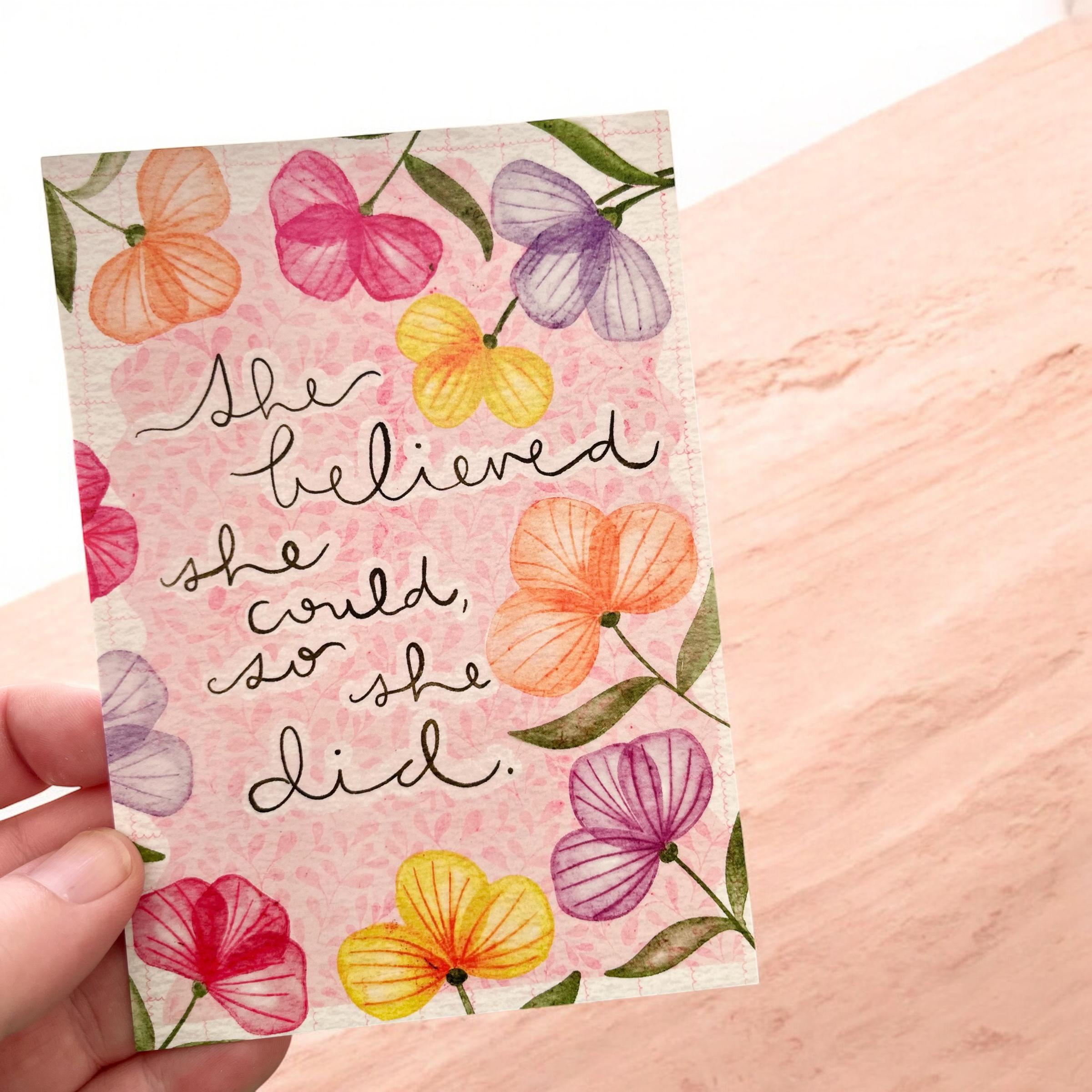 Professionally printed on 350gsm card, these bright and colourful notecards / postcards feature a sweet floral pattern and the words “She believed she could, so she did”. They are a lovely way to jot down some words for a friend, share a recipe or write a to-do list, reminders or notes to the kids or significant other. Handy to have a set on your desk at home or at work.