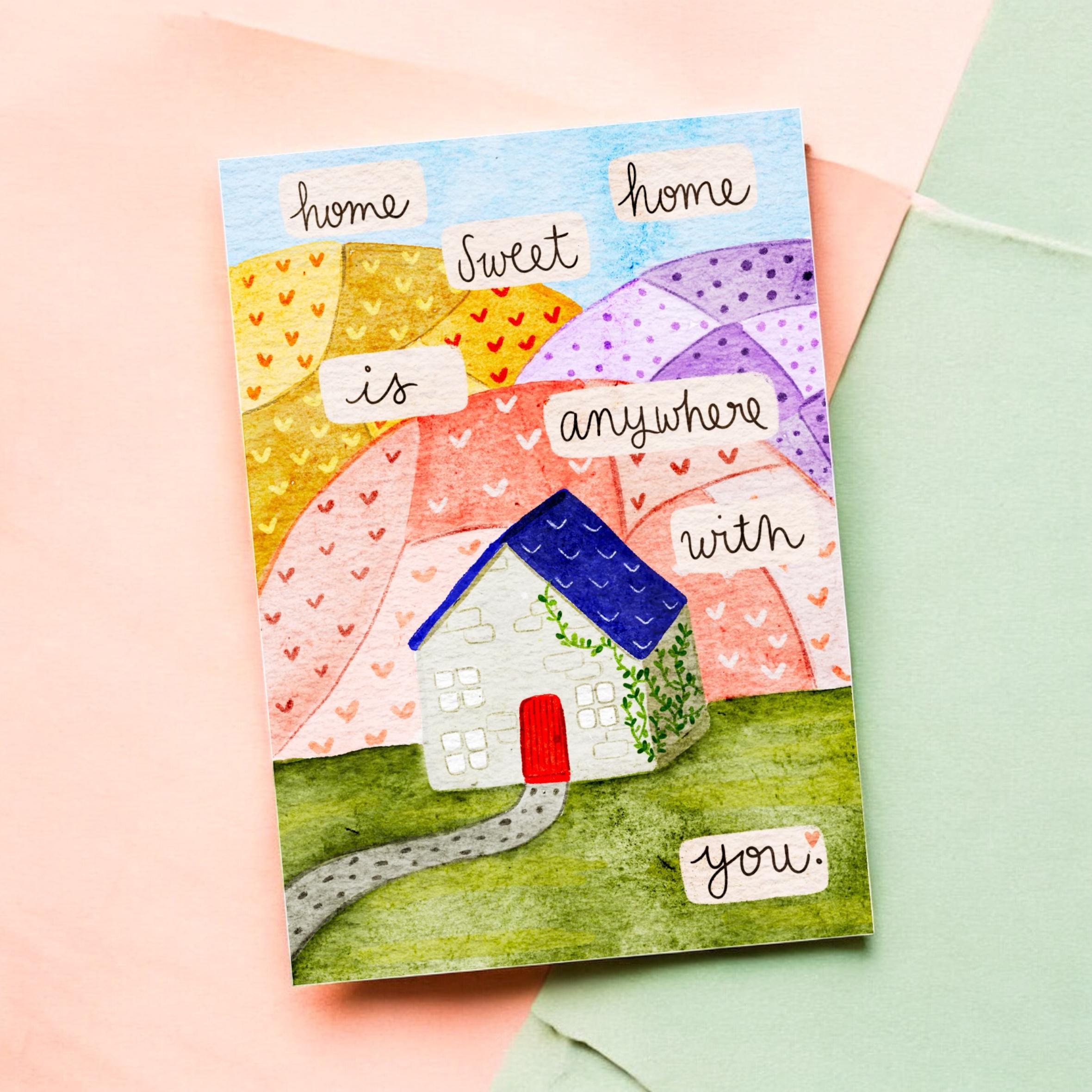 Celebrate love, togetherness and the feeling of home with this beautifully hand-drawn A6 greeting card. Featuring a charming illustrated cottage nestled among rolling hills, this design is finished with the heartfelt words “Home sweet home is anywhere with you” — a perfect sentiment for couples, anniversaries, housewarmings or just because.