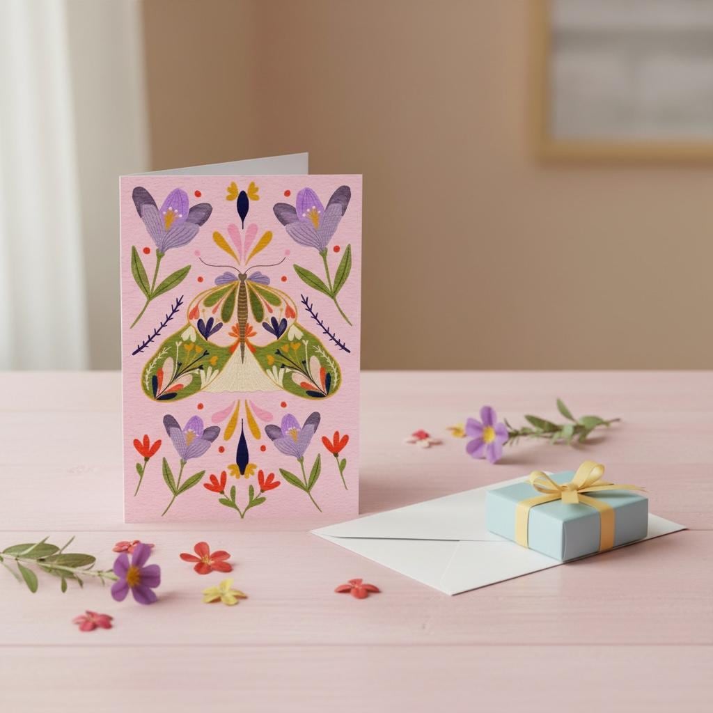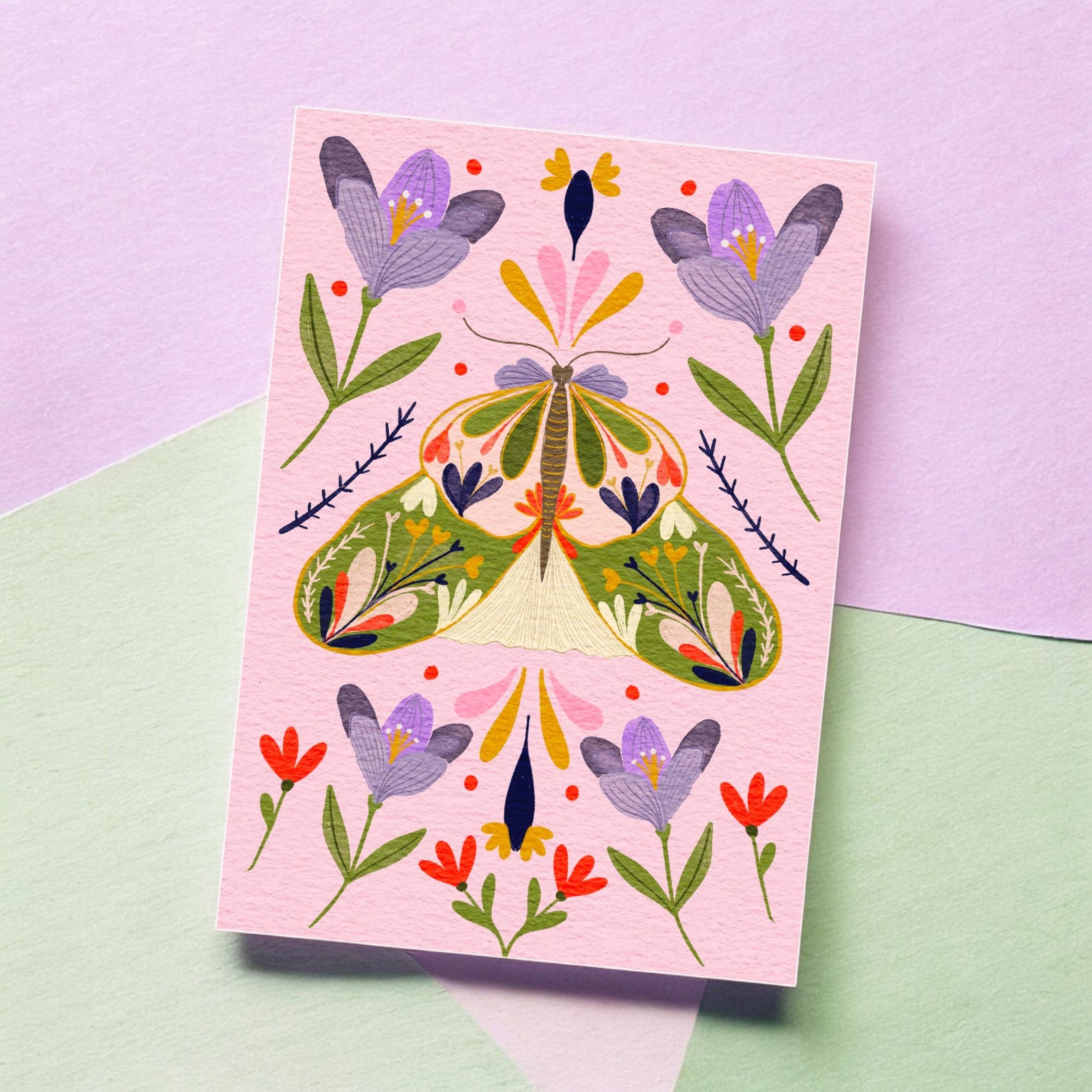 This elegant A6 greeting card features a hand-drawn green moth set against a soft pale pink background. Delicate and whimsical, the design is inspired by nature and makes a beautiful choice for birthdays, thank you notes, thinking-of-you messages or as a small piece of art to gift or display.