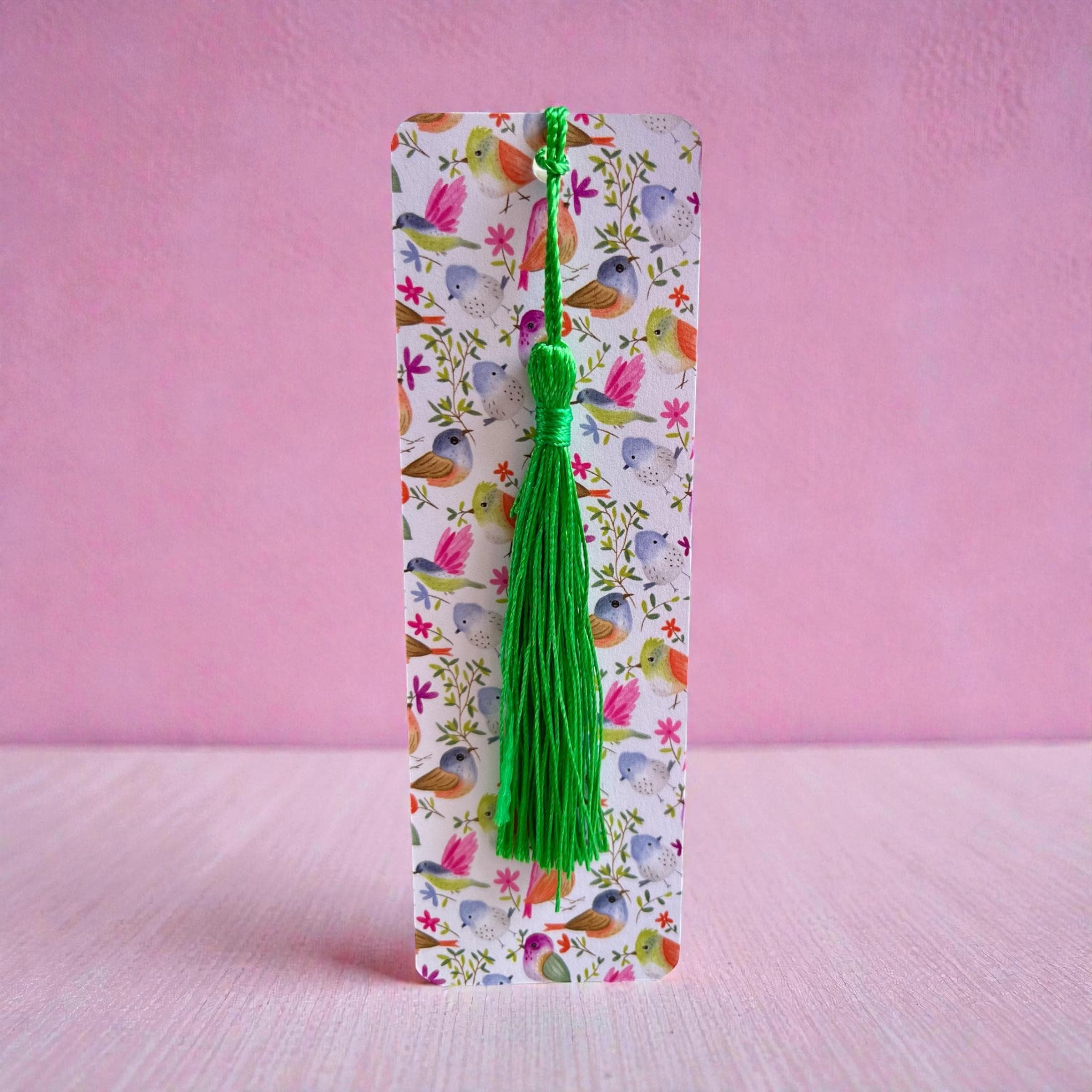 Illustrated Bookmark: Birds and Branches with a Green Tassel
