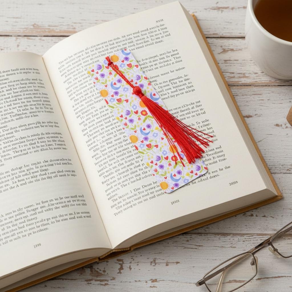 The bookmark features rounded corners for a smooth, finished look and is double sided, with the same illustrated design printed on the back for a polished, high-quality finish. A coordinating tassel is attached at the top, making it easy to find your place and adding a lovely decorative touch.