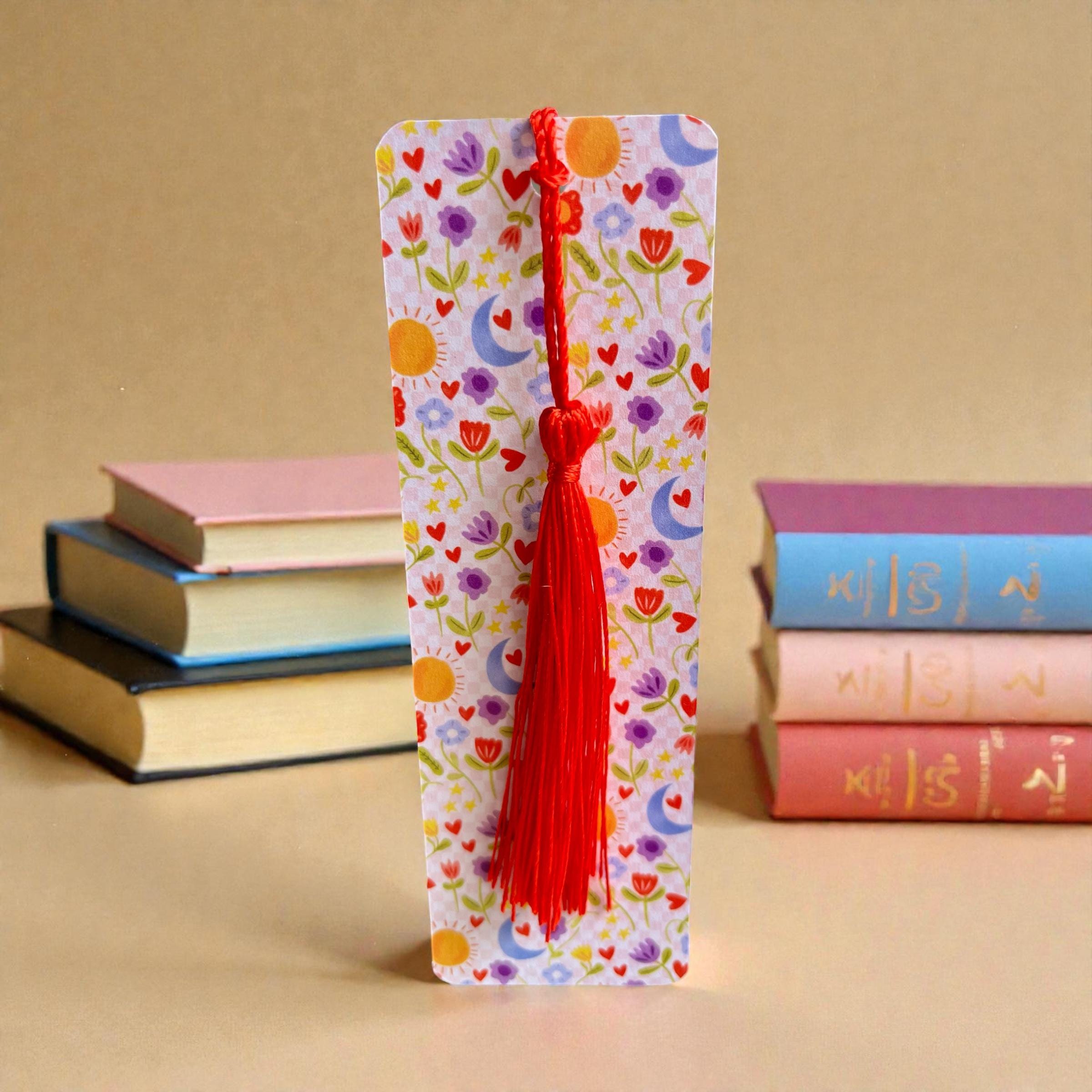 Illustrated Bookmark: Sunshine and Starlight Pattern with a Red Tassel